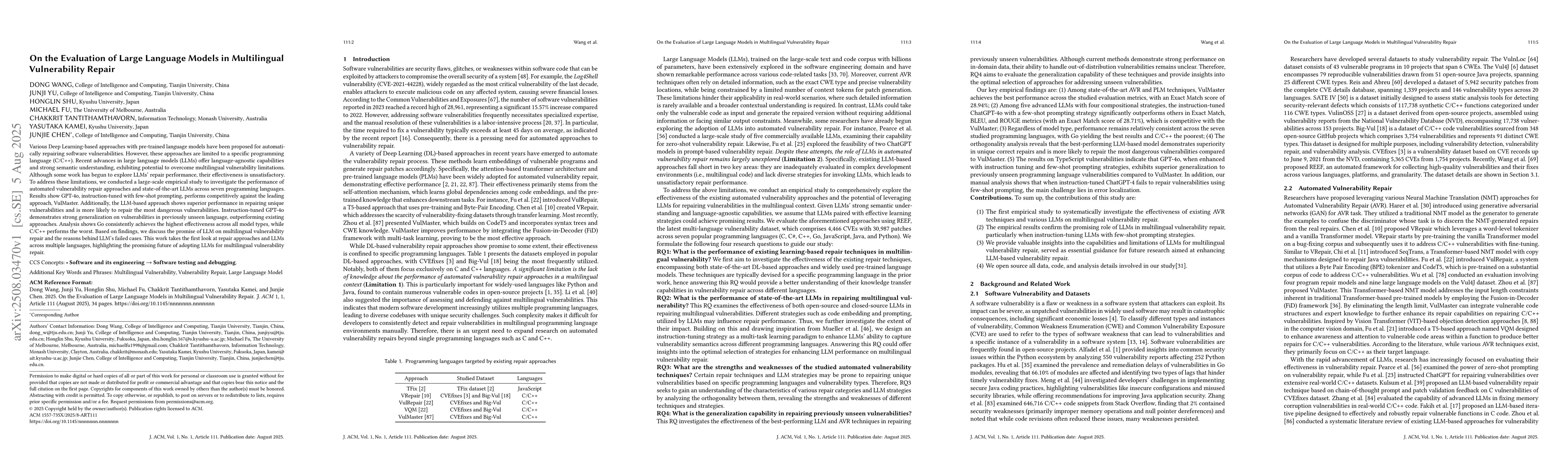 Various Deep Learning-based approaches with pre-trained language models have been proposed for automatically repairing software vulnerabilities. However, these approaches are limited to a specific programming language (C/C++). Recent advances in large language models (LLMs) offer language-agnostic capabilities and strong semantic understanding, exhibiting potential to overcome multilingual vulnerability limitations. Although some work has begun to explore LLMs' repair performance, their effectiveness is unsatisfactory. To address these limitations, we conducted a large-scale empirical study to investigate the performance of automated vulnerability repair approaches and state-of-the-art LLMs across seven programming languages. Results show GPT-4o, instruction-tuned with few-shot prompting, performs competitively against the leading approach, VulMaster. Additionally, the LLM-based approach shows superior performance in repairing unique vulnerabilities and is more likely to repair the most dangerous vulnerabilities. Instruction-tuned GPT-4o demonstrates strong generalization on vulnerabilities in previously unseen language, outperforming existing approaches. Analysis shows Go consistently achieves the highest effectiveness across all model types, while C/C++ performs the worst. Based on findings, we discuss the promise of LLM on multilingual vulnerability repair and the reasons behind LLM's failed cases. This work takes the first look at repair approaches and LLMs across multiple languages, highlighting the promising future of adopting LLMs for multilingual vulnerability repair.