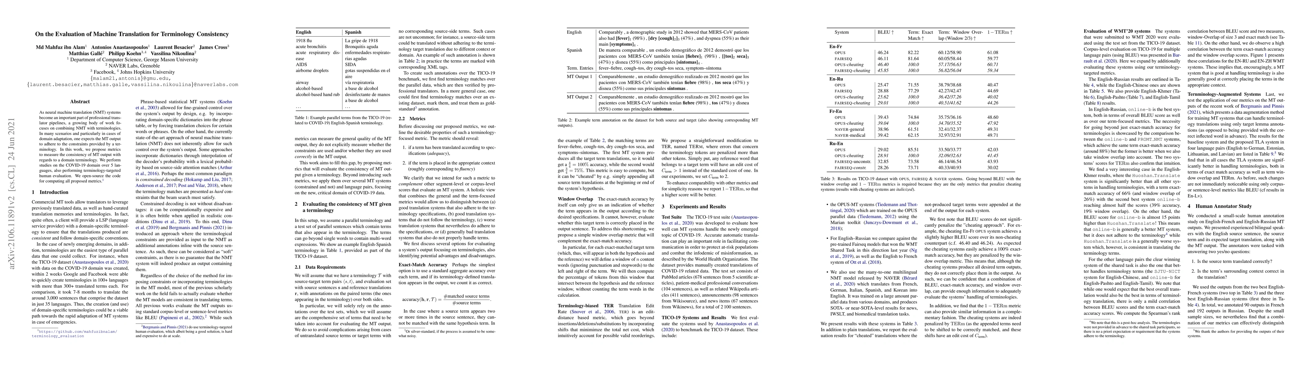 This paper proposes metrics to evaluate the consistency of neural machine translation outputs with domain-specific terminologies, focusing on the COVID-19 domain across 5 languages. The study includes terminology-targeted human evaluations and the authors have released the code for computing the proposed metrics.