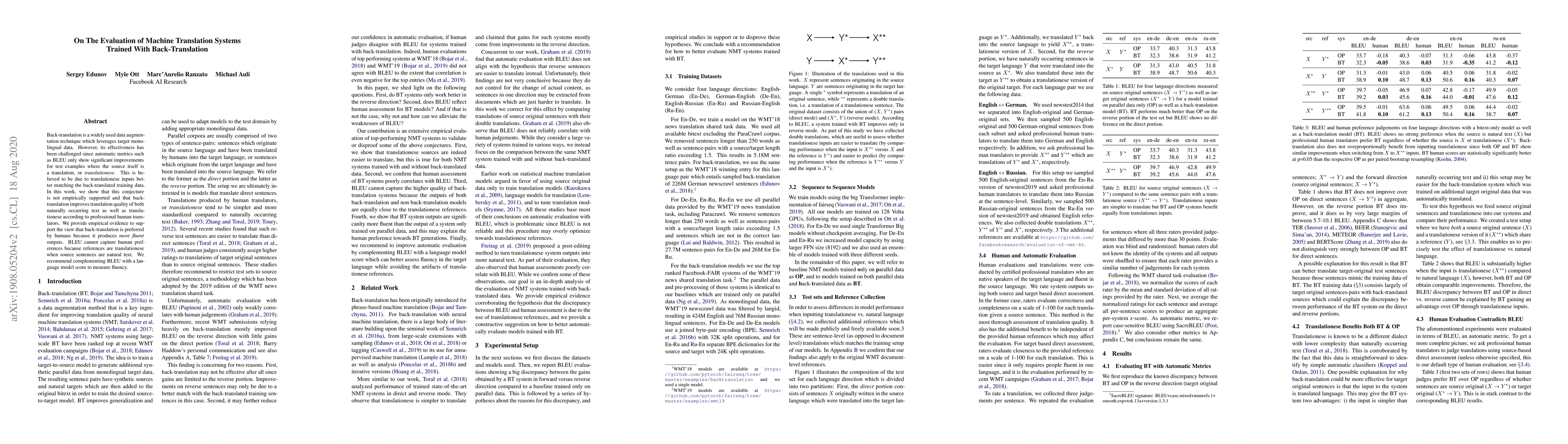 This paper evaluates the effectiveness of back-translation in machine translation, finding that it improves translation quality for both natural and translationese texts, as judged by human translators. The study argues that automatic metrics like BLEU fail to capture human preferences, suggesting the use of a language model score to better measure fluency.