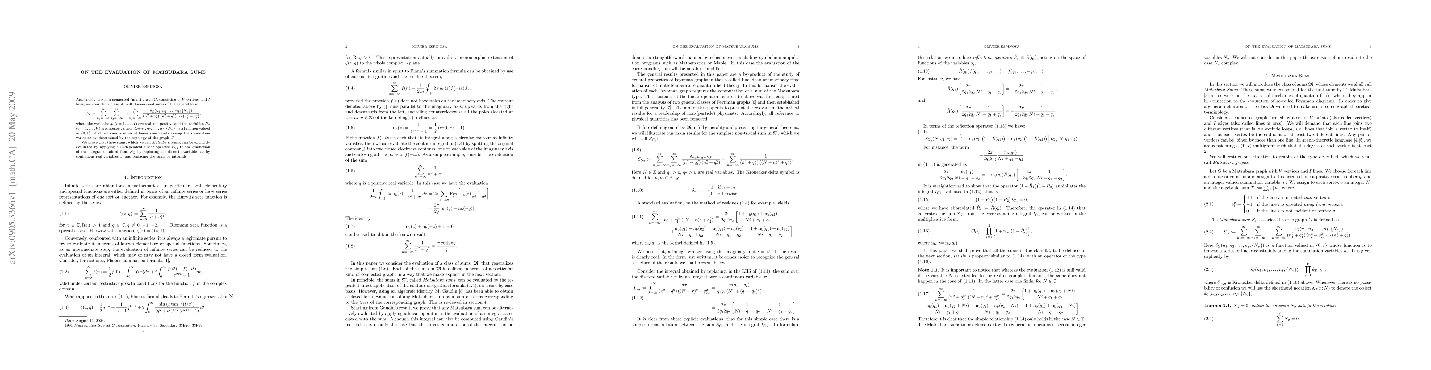 Given a connected (multi)graph G, consisting of V vertices and I lines, we consider a class of multidimensional sums constructed in the following way: - orient the lines of the graph in some (arbitrary) fashion - assign to each line i a positive variable q_i and an integer summation variable n_i - assign to each vertex v an integer variable N_v - construct the following rational function: -- the denominator is a product of factors (n^2+q^2), one for each line of the graph; -- the numerator is a product of Kronecker deltas, one for each vertex of the graph. For each vertex, the Kronecker delta imposes a linear constraint among the summation variables n_i of the lines incident upon the vertex, requiring that the sum of the variables n_i of the lines coming out of vertex minus the sum of the variables n_i of the lines coming into the vertex be equal to the integer variable N assigned to that vertex. - sum over all the n_i variables from minus infinity to infinity The sums thus constructed, called Matsubara sums, are functions of the I real positive variables q_i and the V integer variables N_v. It is shown any Matsubara sum can be evaluated in closed form by applying a linear operator to an integral closely associated with the sum.