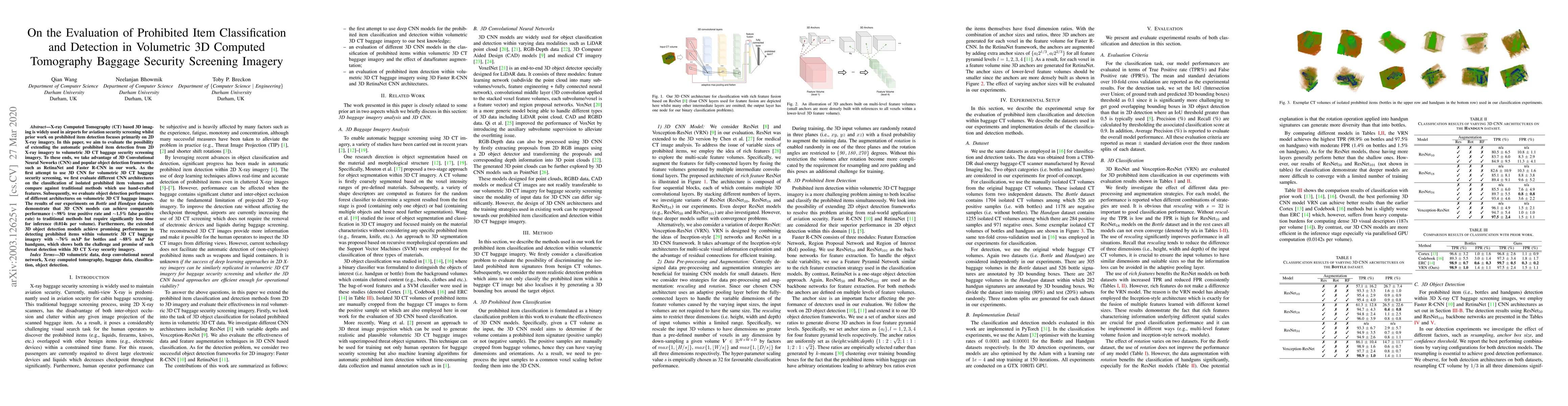 This paper evaluates the use of 3D Convolutional Neural Networks (CNN) for detecting prohibited items in volumetric 3D CT baggage security screening, comparing them to traditional methods using hand-crafted features. Results show that 3D CNNs achieve comparable detection accuracy but with significantly faster inference times, highlighting the potential of this approach for aviation security.