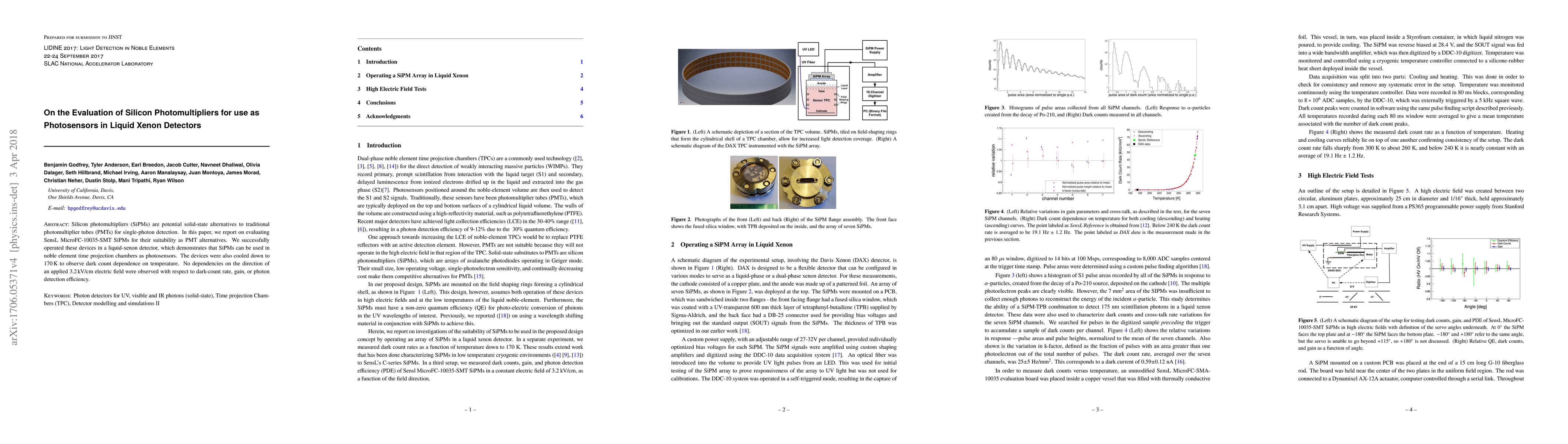 Silicon photomultipliers (SiPMs) are potential solid-state alternatives to traditional photomultiplier tubes (PMTs) for single-photon detection. In this paper, we report on evaluating SensL MicroFC-10035-SMT SiPMs for their suitability as PMT replacements. The devices were successfully operated in a liquid-xenon detector, which demonstrates that SiPMs can be used in noble element time projection chambers as photosensors. The devices were also cooled down to 170 K to observe dark count dependence on temperature. No dependencies on the direction of an applied 3.2 kV/cm electric field were observed with respect to dark-count rate, gain, or photon detection efficiency.