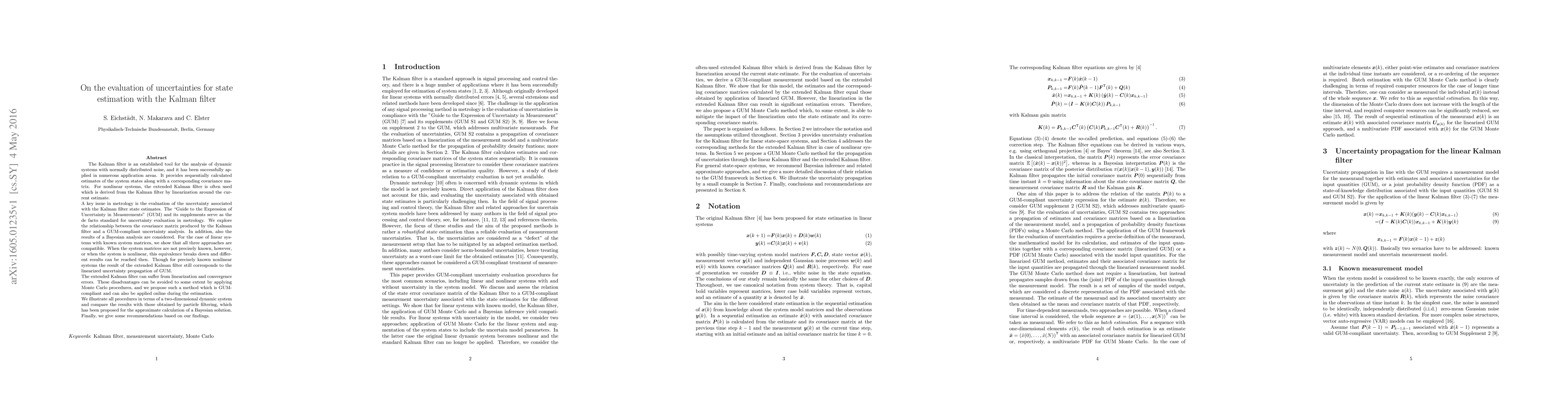 This paper evaluates uncertainties in Kalman filter state estimation, comparing it with GUM-compliant uncertainty analysis and Bayesian methods. For linear systems with known matrices, the Kalman filter, extended Kalman filter, and Bayesian analysis yield compatible results, but discrepancies arise when matrices are unknown or systems are nonlinear. The paper proposes a GUM-compliant Monte Carlo method to mitigate extended Kalman filter's linearization and convergence errors.