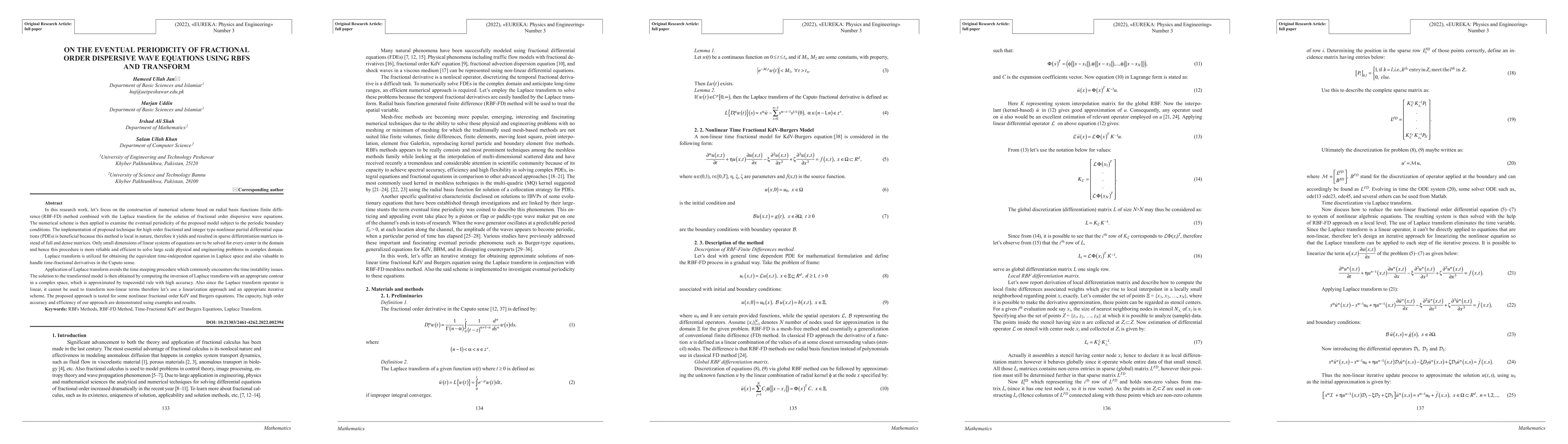 In this research work, let us focus on the construction of numerical scheme based on radial basis functions finite difference (RBF-FD) method combined with the Laplace transform for the solution of fractional order dispersive wave equations. The numerical scheme is then applied to examine the eventual periodicity of the proposed model subject to the periodic boundary conditions. The implementation of proposed technique for high order fractional and integer type nonlinear partial differential equations (PDEs) is beneficial because this method is local in nature, therefore it yields and resulted in sparse differentiation matrices instead of full and dense matrices. Only small dimensions of linear systems of equations are to be solved for every center in the domain and hence this procedure is more reliable and efficient to solve large scale physical and engineering problems in complex domain. Laplace transform is utilized for obtaining the equivalent time-independent equation in Laplace space and also valuable to handle time-fractional derivatives in the Caputo sense. Application of Laplace transform avoids the time steeping procedure which commonly encounters the time instability issues. The solution to the transformed model is then obtained by computing the inversion of Laplace transform with an appropriate contour in a complex space, which is approximated by trapezoidal rule with high accuracy. Also since the Laplace transform operator is linear, it cannot be used to transform non-linear terms therefore let us use a linearization approach and an appropriate iterative scheme. The proposed approach is tasted for some nonlinear fractional order KdV and Burgers equations. The capacity, high order accuracy and efficiency of our approach are demonstrated using examples and results