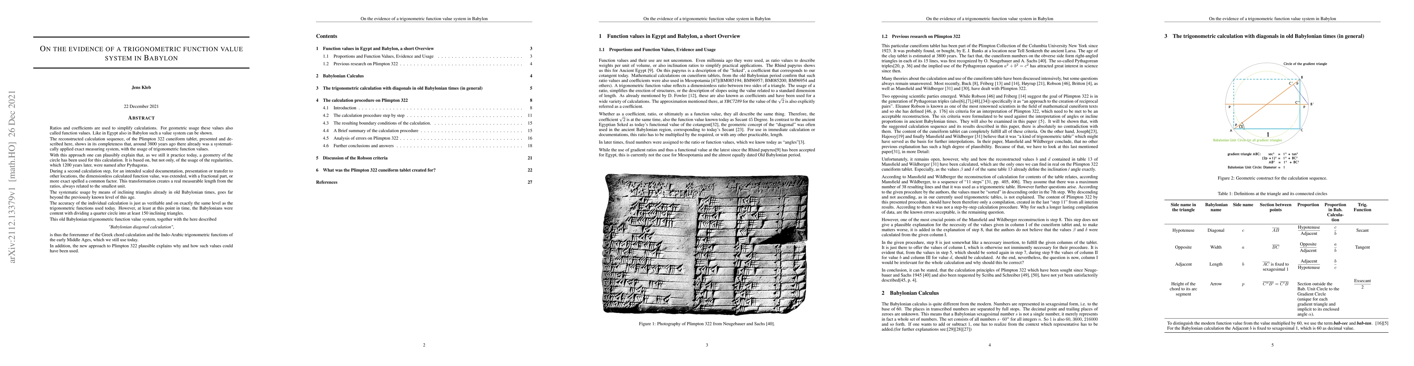 Ratios and coefficients are used to simplify calculations. For geometric usage these values also called function values. Like in Egypt also in Babylon such a value system can be shown. The reconstructed calculation sequence, of the Plimpton 322 cuneiform tablet, presented and described here, shows in its completeness that, around 3800 years ago there already was a systematically applied exact measuring system, with the usage of trigonometric function values. With this approach one can plausibly explain that, as we still it practice today, a geometry of the circle has been used for this calculation. It is based on, but not only, of the usage of the regularities, which 1200 years later, were named after Pythagoras. During a second calculation step, for an intended scaled documentation, presentation or transfer to other locations, the dimensionless calculated function value, was extended, with a fractional part, or more exact spelled a common factor. This transformation creates a real measurable length from the ratios, always related to the smallest unit. The systematic usage by means of inclining triangles already in old Babylonian times, goes far beyond the previously known level of this age. The accuracy of the individual calculation is just as verifiable and on exactly the same level as the trigonometric functions used today. However, at least at this point in time, the Babylonians were content with dividing a quarter circle into at least 150 inclining triangles. This old Babylonian trigonometric function value system, together with the here described "Babylonian diagonal calculation", is thus the forerunner of the Greek chord calculation and the Indo-Arabic trigonometric functions of the early Middle Ages, which we still use today. In addition, the new approach to Plimpton 322 plausible explains why and how such values could have been used.