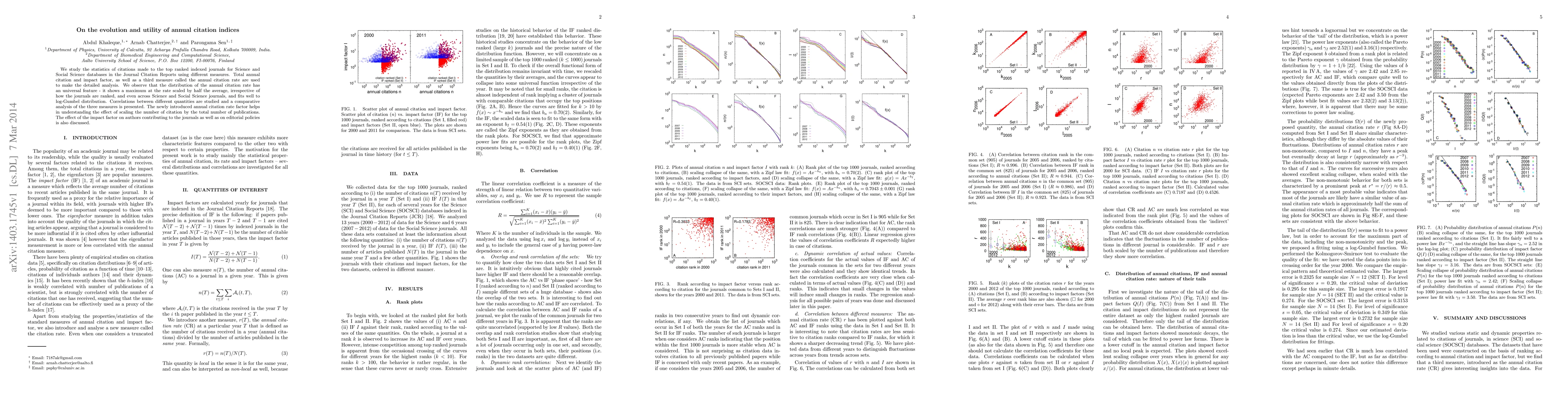 We study the statistics of citations made to the top ranked indexed journals for Science and Social Science databases in the Journal Citation Reports using different measures. Total annual citation and impact factor, as well as a third measure called the annual citation rate are used to make the detailed analysis. We observe that the distribution of the annual citation rate has an universal feature - it shows a maximum at the rate scaled by half the average, irrespective of how the journals are ranked, and even across Science and Social Science journals, and fits well to log-Gumbel distribution. Correlations between different quantities are studied and a comparative analysis of the three measures is presented. The newly introduced annual citation rate factor helps in understanding the effect of scaling the number of citation by the total number of publications. The effect of the impact factor on authors contributing to the journals as well as on editorial policies is also discussed.