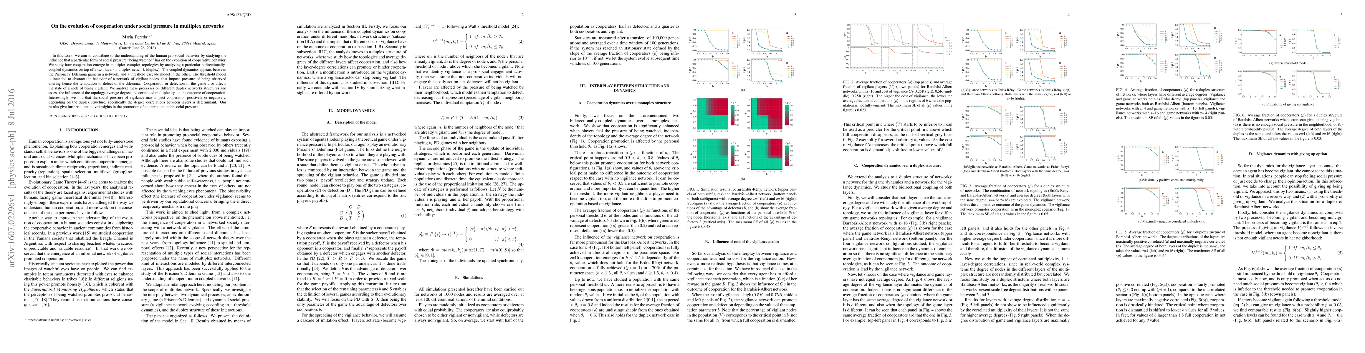 In this work, we aim to contribute to the understanding of the human pro-social behavior by studying the influence that a particular form of social pressure "being watched" has on the evolution of cooperative behavior. We study how cooperation emerge in multiplex complex topologies by analyzing a particular bidirectionally-coupled dynamics on top of a two-layers multiplex network (duplex). The coupled dynamics appears between the Prisoner's Dilemma game in a network, and a threshold cascade model in the other. The threshold model is intended to abstract the behavior of a network of vigilant nodes, that impose pressure of being observed altering hence the temptation to defect of the dilemma. Cooperation or defection in the game also affects the state of a node of being vigilant. We analyze these processes on different duplex networks structures and assess the influence of the topology, average degree and correlated multiplexity, on the outcome of cooperation. Interestingly, we find that the social pressure of vigilance may impact cooperation positively or negatively, depending on the duplex structure, specifically the degree correlations between layers is determinant. Our results give further quantitative insights in the promotion of cooperation under social pressure.