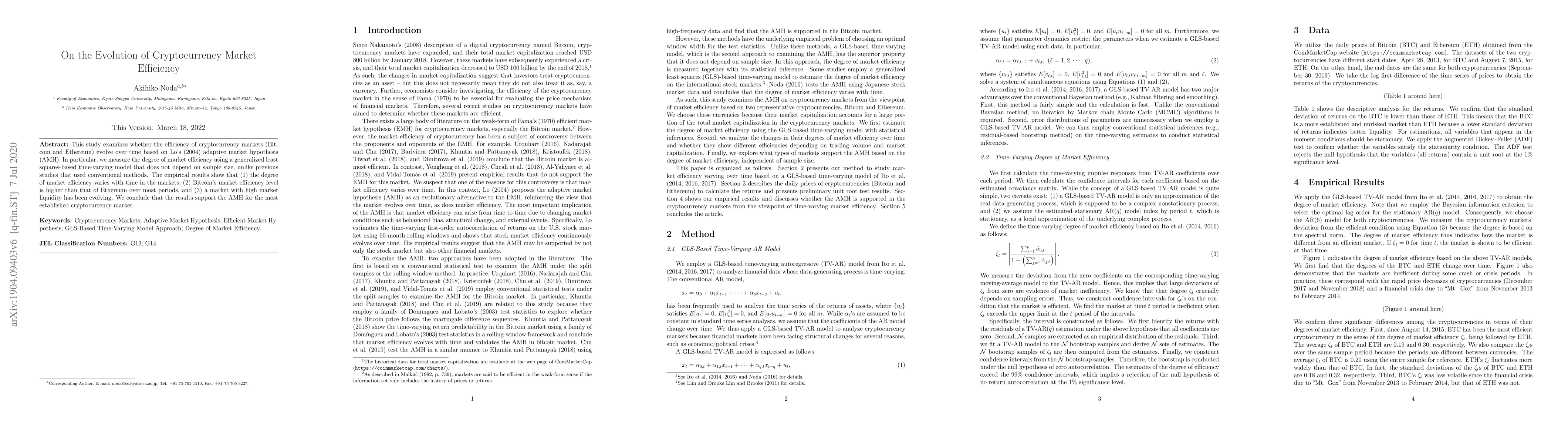 This study examines whether the efficiency of cryptocurrency markets (Bitcoin and Ethereum) evolve over time based on Lo's (2004) adaptive market hypothesis (AMH). In particular, we measure the degree of market efficiency using a generalized least squares-based time-varying model that does not depend on sample size, unlike previous studies that used conventional methods. The empirical results show that (1) the degree of market efficiency varies with time in the markets, (2) Bitcoin's market efficiency level is higher than that of Ethereum over most periods, and (3) a market with high market liquidity has been evolving. We conclude that the results support the AMH for the most established cryptocurrency market.