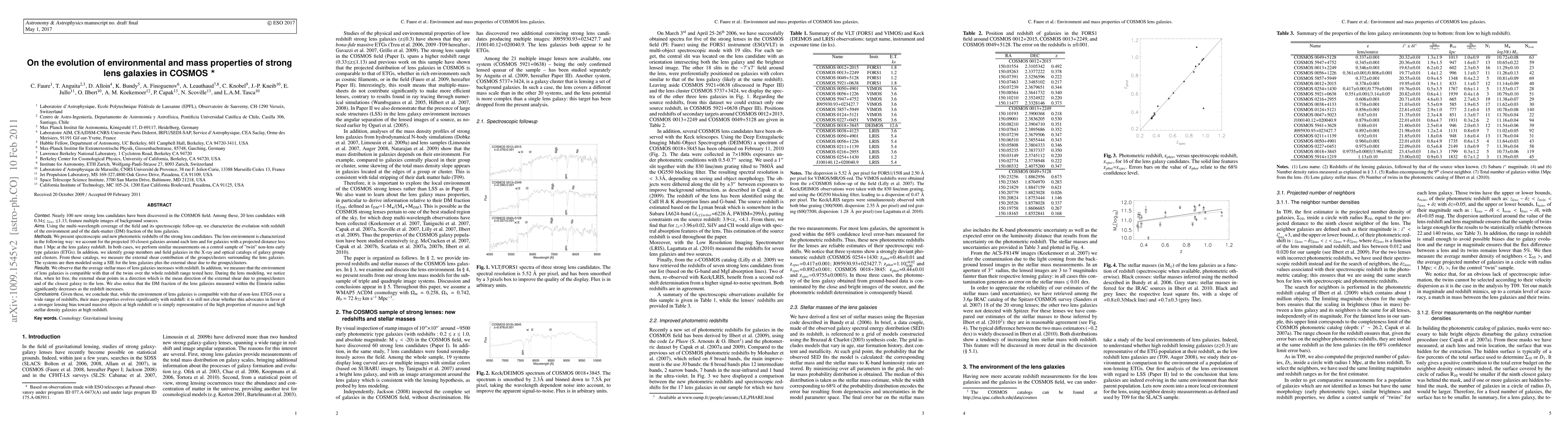 Among the 100 strong lens candidates found in the COSMOS field, 20 with redshifts in the range [0.34,1.13], feature multiple images of background sources. Using the multi-wavelength coverage of the field and its spectroscopic follow-up, we characterize the evolution with redshift of the environment and of the dark-matter (DM) fraction of the lens galaxies. We present new redshift of the strong lens candidates. The lens environment is characterized by the projected 10 closest galaxies around each lens and by the number of galaxies with a projected distance less than 1Mpc at the lens galaxy redshift. In both cases, we perform similar measurements on a control sample of twin non-lens early type galaxies (ETGs). In addition, we identify group members and field galaxies in the X-ray and optical catalogs of galaxy groups. From those catalogs, we measure the external shear contribution at the lens galaxy positions. The systems are then modeled using a SIE plus the external shear due to the groups. We observe that the average stellar mass of lens galaxies increases with z and that the environment of lens galaxies is compatible with that of the twins. During the lens modeling, we notice that, when let free, the external shear points in a direction which is the mean direction of the external shear due to groups and of the closest galaxy to the lens. We notice that the DM fraction of the lens galaxies within the Einstein radius decreases as the redshift increases. Given these, we conclude that, while the environment of lens galaxies is compatible with that of non-lens ETGS, their mass properties evolves significantly with redshift: it is still not clear whether this advocates in favor of a stronger lensing bias toward massive objects at high redshift or is simply representative of the high proportion of massive and high stellar density galaxies at high redshift.