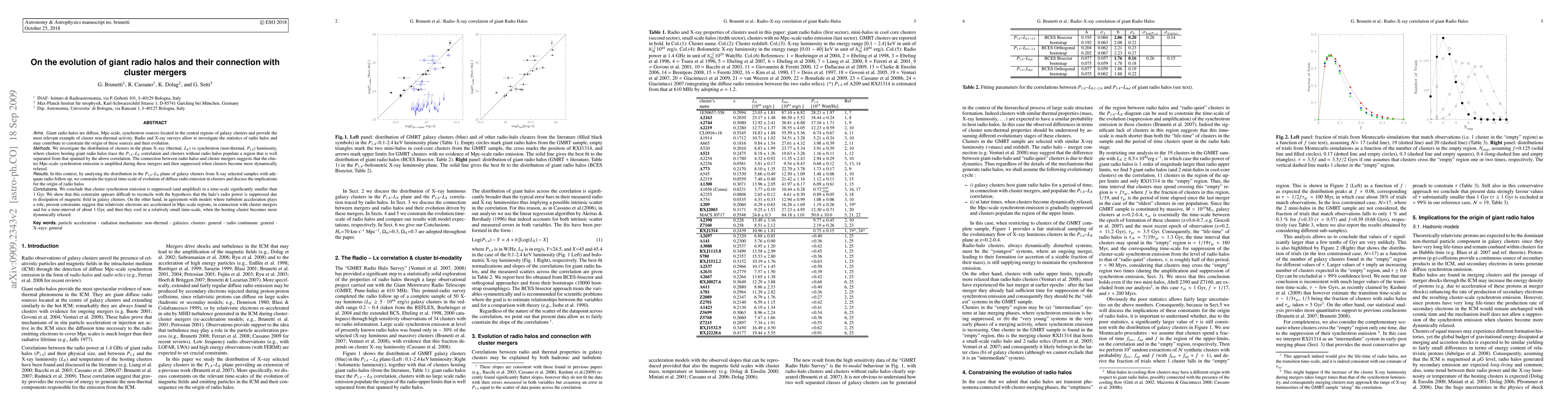 Giant radio halos are diffuse, Mpc-scale, synchrotron sources located in the central regions of galaxy clusters and provide the most relevant example of cluster non-thermal activity. Radio and X-ray surveys allow to investigate the statistics of halos and may contribute to constrain their origin and evolution. We investigate the distribution of clusters in the plane X-ray (thermal, L_X) vs synchrotron (P_{1.4})luminosity, where clusters hosting giant radio halos trace the P_{1.4}--L_X correlation and clusters without radio halos populate a region that is well separated from that spanned by the above correlation. The connection between radio halos and cluster mergers suggests that the cluster Mpc-scale synchrotron emission is amplified during these mergers and then suppressed when clusters become more dynamically relaxed. In this context, by analysing the distribution in the P_{1.4}--L_X plane of clusters from X-ray selected samples with adequate radio follow up, we constrain the typical time-scale of evolution of diffuse radio emission in clusters and discuss the implications for the origin of radio halos. We conclude that cluster synchrotron emission is suppressed (and amplified) in a time-scale significantly smaller than 1 Gyr. We show that this constraint appears difficult to reconcile with the hypothesis that the halo's radio power is suppressed due to dissipation of magnetic field in galaxy clusters. On the other hand, in agreement with models where turbulent acceleration plays a role, present constraints suggest that relativistic electrons are accelerated in Mpc-scale regions, in connection with cluster mergers and for a time-interval of about 1 Gyr, and then they cool in a relatively small time-scale, when the hosting cluster becomes more dynamically relaxed.
