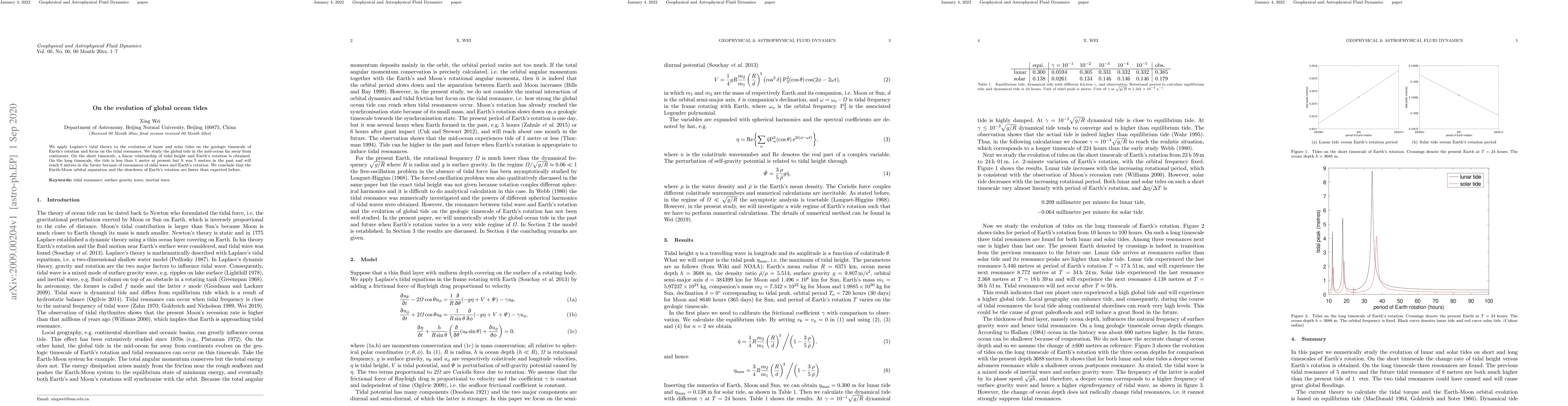 This study uses Laplace's tidal theory to analyze Earth's tidal evolution over geological time. It reveals that past and future global tidal heights, currently less than 1 meter, were 5 meters and will reach 8 meters respectively, due to resonances between tidal waves and Earth's rotation. The findings suggest Earth-Moon orbital separation and Earth's rotation slowdown are progressing faster than previously estimated.