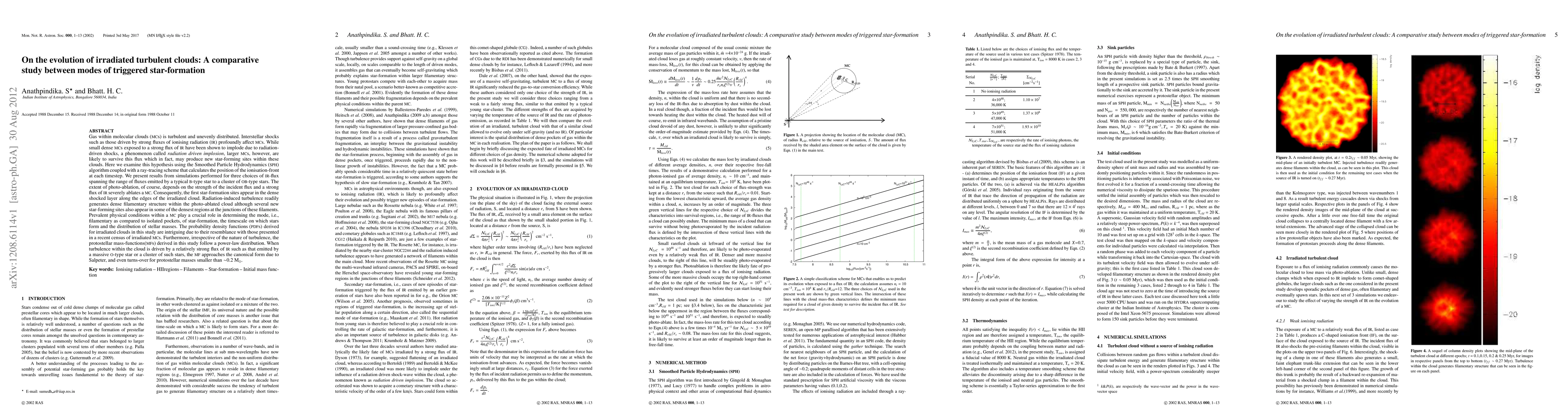 Here we examine the evolution of irradiated clouds using the Smoothed Particle Hydrodynamics ({\small SPH}) algorithm coupled with a ray-tracing scheme that calculates the position of the ionisation-front at each timestep. We present results from simulations performed for three choices of {\small IR}-flux spanning the range of fluxes emitted by a typical {\small B}-type star to a cluster of {\small OB}-type stars. The extent of photo-ablation, of course, depends on the strength of the incident flux and a strong flux of {\small IR} severely ablates a {\small MC}. Consequently, the first star-formation sites appear in the dense shocked layer along the edges of the irradiated cloud. Radiation-induced turbulence readily generates dense filamentary structure within the photo-ablated cloud although several new star-forming sites also appear in some of the densest regions at the junctions of these filaments. Prevalent physical conditions within a {\small MC} play a crucial role in determining the mode, i.e., filamentary as compared to isolated pockets, of star-formation, the timescale on which stars form and the distribution of stellar masses. The probability density functions ({\small PDF}s) derived for irradiated clouds in this study are intriguing due to their resemblance with those presented in a recent census of irradiated {\small MC}s. Furthermore, irrespective of the nature of turbulence, the protostellar mass-functions({\small MF}s) derived in this study follow a power-law distribution. When turbulence within the cloud is driven by a relatively strong flux of {\small IR} such as that emitted by a massive {\small O}-type star or a cluster of such stars, the {\small MF} approaches the canonical form due to Salpeter, and even turns-over for protostellar masses smaller than $\sim$0.2 M$_{\odot}$.