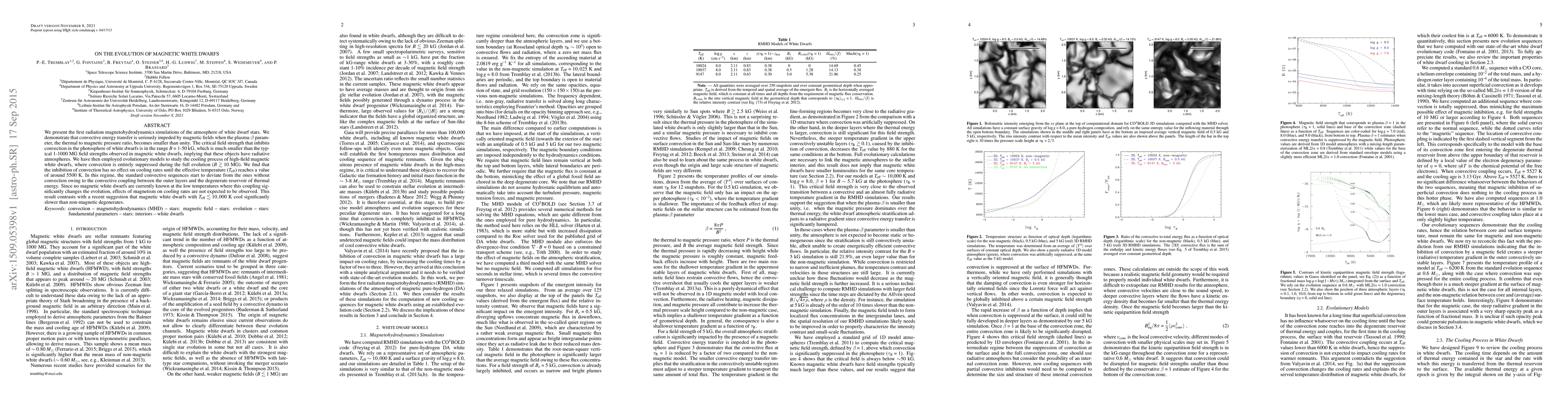 We present the first radiation magnetohydrodynamics simulations of the atmosphere of white dwarf stars. We demonstrate that convective energy transfer is seriously impeded by magnetic fields when the plasma-beta parameter, the thermal to magnetic pressure ratio, becomes smaller than unity. The critical field strength that inhibits convection in the photosphere of white dwarfs is in the range B = 1-50 kG, which is much smaller than the typical 1-1000 MG field strengths observed in magnetic white dwarfs, implying that these objects have radiative atmospheres. We have then employed evolutionary models to study the cooling process of high-field magnetic white dwarfs, where convection is entirely suppressed during the full evolution (B > 10 MG). We find that the inhibition of convection has no effect on cooling rates until the effective temperature (Teff) reaches a value of around 5500 K. In this regime, the standard convective sequences start to deviate from the ones without convection owing to the convective coupling between the outer layers and the degenerate reservoir of thermal energy. Since no magnetic white dwarfs are currently known at the low temperatures where this coupling significantly changes the evolution, effects of magnetism on cooling rates are not expected to be observed. This result contrasts with a recent suggestion that magnetic white dwarfs with Teff < 10,000 K cool significantly slower than non-magnetic degenerates.
