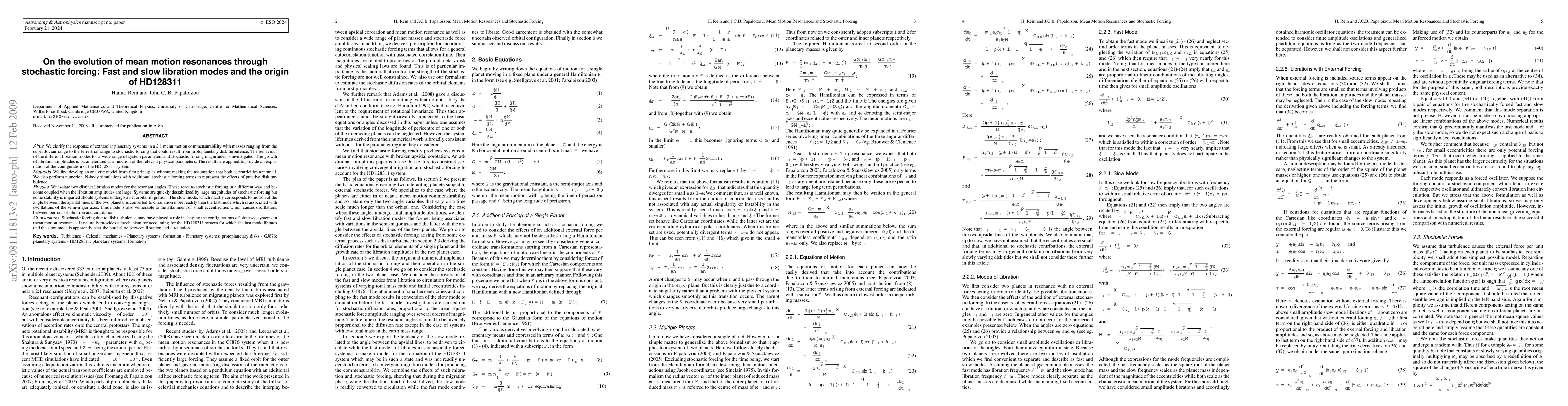 Aims. We clarify the response of extrasolar planetary systems in a 2:1 mean motion commensurability with masses ranging from the super Jovian range to the terrestrial range to stochastic forcing that could result from protoplanetary disk turbulence. The behaviour of the different libration modes for a wide range of system parameters and stochastic forcing magnitudes is investigated. The growth of libration amplitudes is parameterized as a function of the relevant physical parameters. The results are applied to provide an explanation of the configuration of the HD128311 system. Methods. We first develop an analytic model from first principles without making the assumption that both eccentricities are small. We also perform numerical N-body simulations with additional stochastic forcing terms to represent the effects of putative disk turbulence. Results. Systems are quickly destabilized by large magnitudes of stochastic forcing but some stability is imparted should systems undergo a net orbital migration. The slow mode, which mostly corresponds to motion of the angle between the apsidal lines of the two planets, is converted to circulation more readily than the fast mode which is associated with oscillations of the semi-major axes. This mode is also vulnerable to the attainment of small eccentricities which causes oscillations between periods of libration and circulation. Conclusions. Stochastic forcing due to disk turbulence may have played a role in shaping the configurations of observed systems in mean motion resonance. It naturally provides a mechanism for accounting for the HD128311 system.