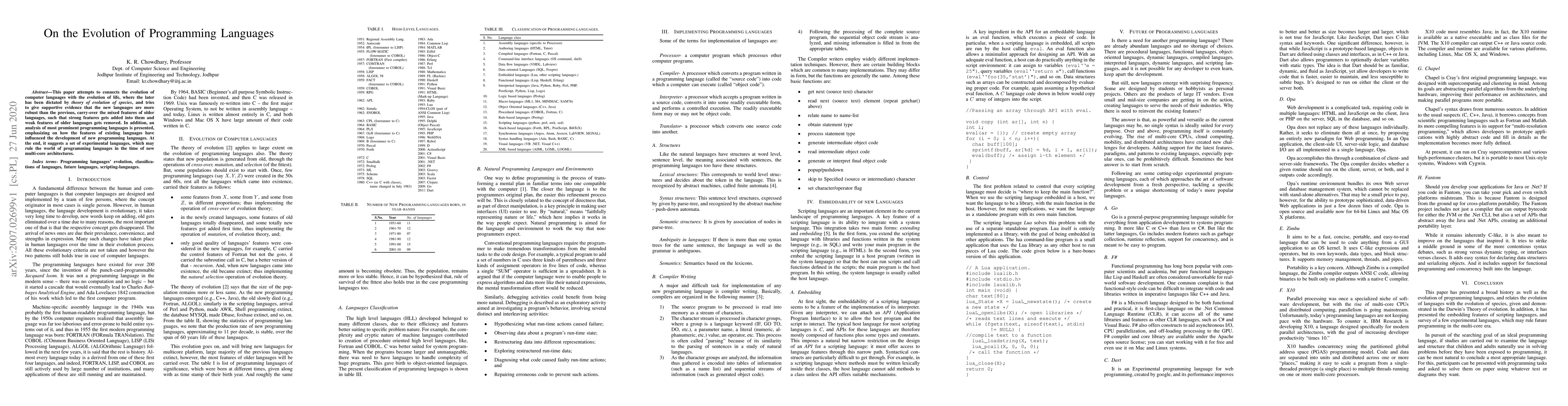 This paper explores the analogy between the evolution of programming languages and biological evolution, arguing that new languages inherit robust features from older ones while discarding their weaknesses. It analyzes prominent languages and proposes experimental languages suited for future multi-core architectures.