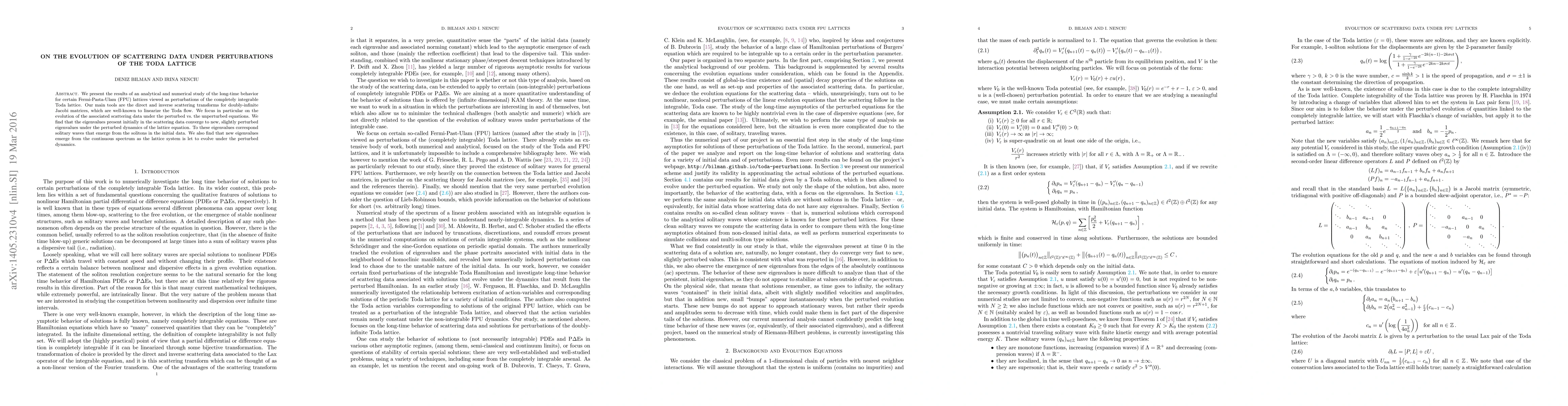 We present the results of an analytical and numerical study of the long-time behavior for certain Fermi-Pasta-Ulam (FPU) lattices viewed as perturbations of the completely integrable Toda lattice. Our main tools are the direct and inverse scattering transforms for doubly-infinite Jacobi matrices, which are well-known to linearize the Toda flow. We focus in particular on the evolution of the associated scattering data under the perturbed vs. the unperturbed equations. We find that the eigenvalues present initially in the scattering data converge to new, slightly perturbed eigenvalues under the perturbed dynamics of the lattice equation. To these eigenvalues correspond solitary waves that emerge from the solitons in the initial data. We also find that new eigenvalues emerge from the continuous spectrum as the lattice system is let to evolve under the perturbed dynamics.