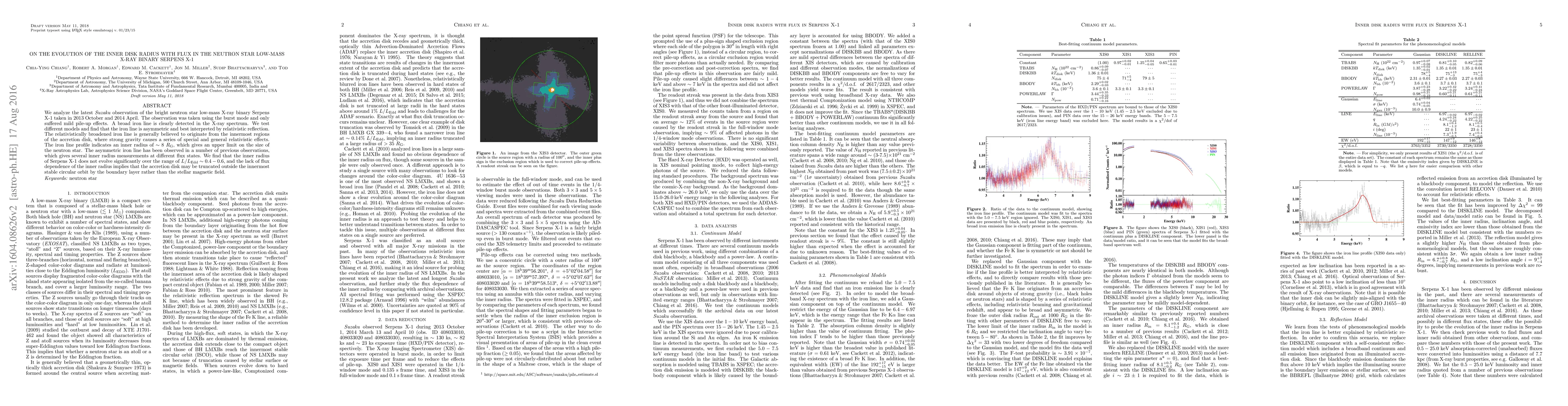 We analyze the latest \emph{Suzaku} observation of the bright neutron star low-mass X-ray binary Serpens X-1 taken in 2013 October and 2014 April. The observation was taken using the burst mode and only suffered mild pile-up effects. A broad iron line is clearly detected in the X-ray spectrum. We test different models and find that the iron line is asymmetric and best interpreted by relativistic reflection. The relativistically broadened iron line is generally believed to originate from the innermost regions of the accretion disk, where strong gravity causes a series of special and general relativistic effects. The iron line profile indicates an inner radius of $\sim8$ $R_{\rm G}$, which gives an upper limit on the size of the neutron star. The asymmetric iron line has been observed in a number of previous observations, which gives several inner radius measurements at different flux states. We find that the inner radius of Serpens X-1 does not evolve significantly over the range of $L/L_{\rm Edd}\sim0.4-0.6$, and the lack of flux dependence of the inner radius implies that the accretion disk may be truncated outside the innermost stable circular orbit by the boundary layer rather than the stellar magnetic field.
