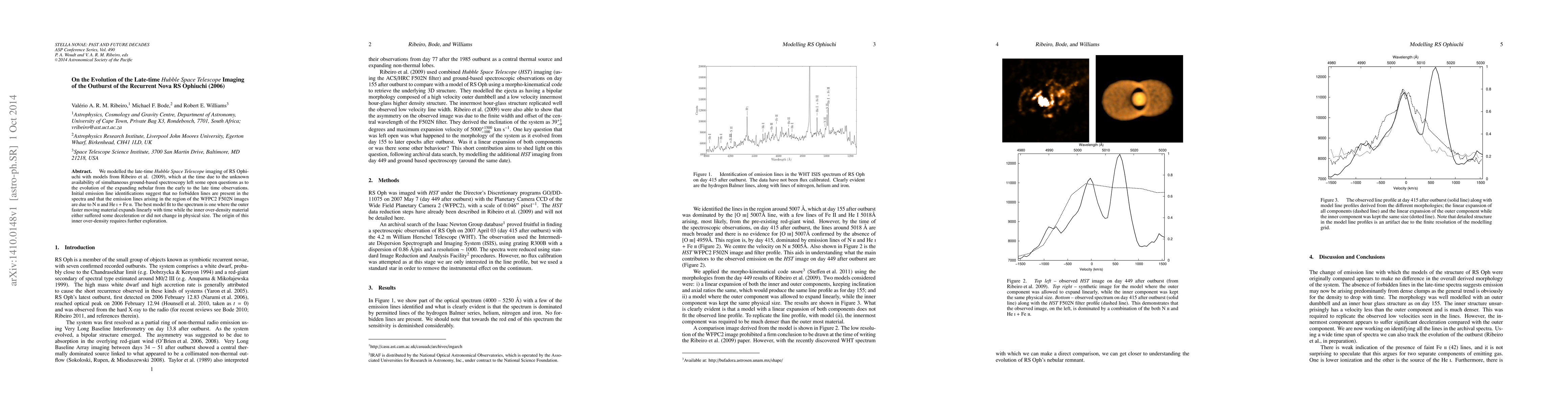 We modelled the late-time {\it Hubble Space Telescope} imaging of RS Ophiuchi with models from Ribeiro et al. (2009), which at the time due to the unknown availability of simultaneous ground-based spectroscopy left some open questions as to the evolution of the expanding nebular from the early to the late time observations. Initial emission line identifications suggest that no forbidden lines are present in the spectra and that the emission lines arising in the region of the WFPC2 F502N images are due to N{\sc ii} and He{\sc i} + Fe{\sc ii}. The best model fit to the spectrum is one where the outer faster moving material expands linearly with time while the inner over-density material either suffered some deceleration or did not change in physical size. The origin of this inner over-density requires further exploration.