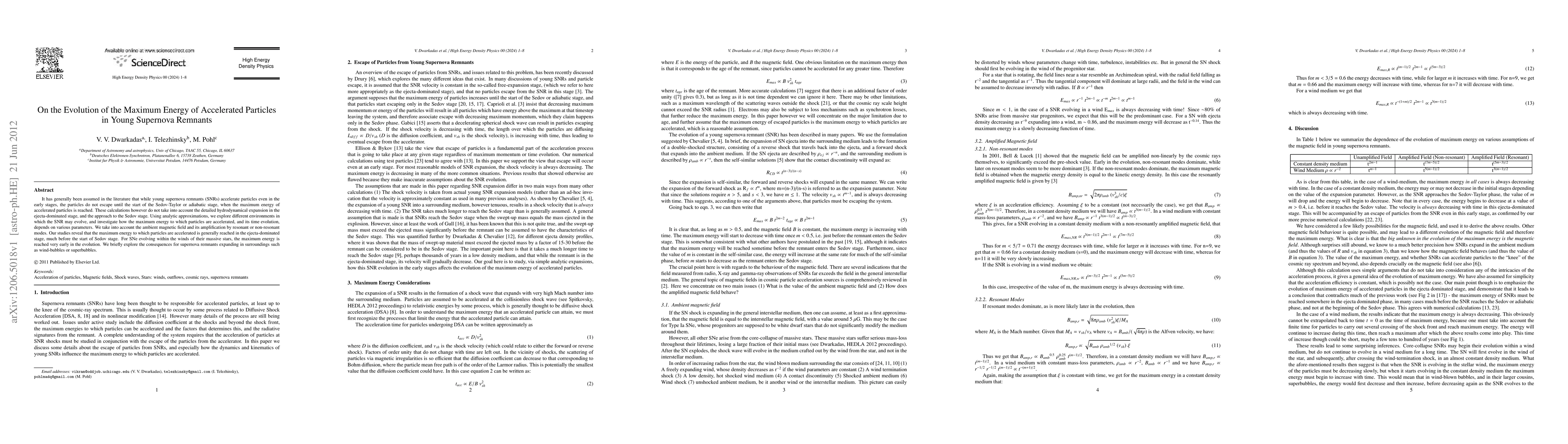 It has generally been assumed in the literature that while young supernova remnants (SNRs) accelerate particles even in the early stages, the particles do not escape until the start of the Sedov-Taylor or adiabatic stage, when the maximum energy of accelerated particles is reached. These calculations however do not take into account the detailed hydrodynamical expansion in the ejecta-dominated stage, and the approach to the Sedov stage. Using analytic approximations, we explore different environments in which the SNR may evolve, and investigate how the maximum energy to which particles are accelerated, and its time evolution, depends on various parameters. We take into account the ambient magnetic field and its amplification by resonant or non-resonant modes. Our studies reveal that the maximum energy to which particles are accelerated is generally reached in the ejecta-dominated stage, much before the start of Sedov stage. For SNe evolving within the winds of their massive stars, the maximum energy is reached very early in the evolution. We briefly explore the consequences for supernova remnants expanding in surroundings such as wind-bubbles or superbubbles.