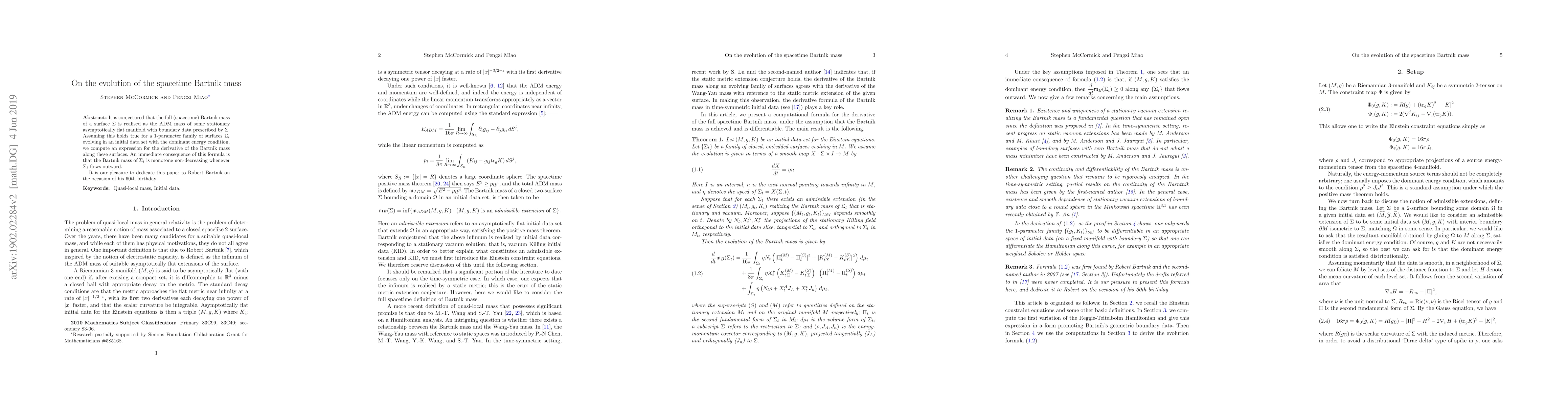 This paper explores the evolution of the spacetime Bartnik mass for a family of surfaces evolving under the dominant energy condition, deriving an expression for its derivative and proving that the Bartnik mass is monotone non-decreasing when the surfaces flow outward. The work is dedicated to Robert Bartnik on his 60th birthday.