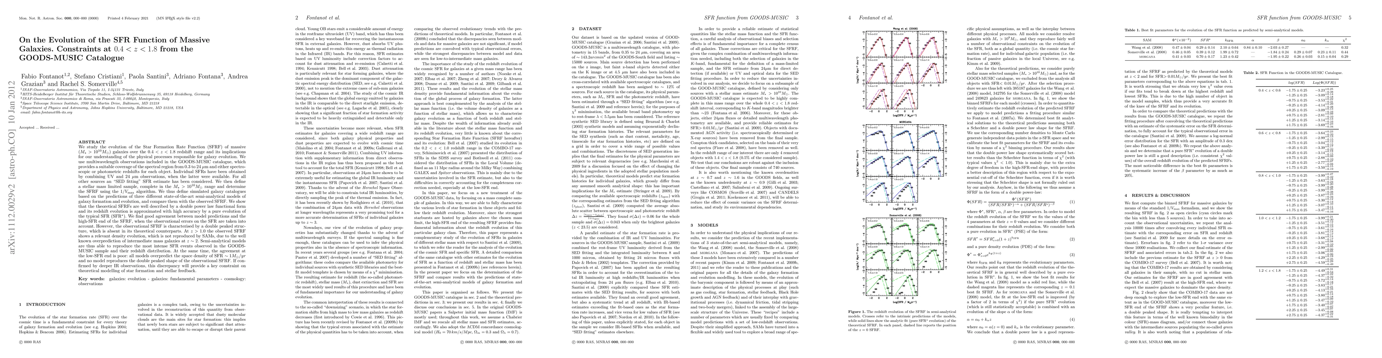 This paper investigates the evolution of the Star Formation Rate Function (SFRF) of massive galaxies from redshifts 0.4 to 1.8, using the GOODS-MUSIC catalogue. It finds that while theoretical models accurately predict the high-SFR end, they fail to match the double peaked structure and low-SFR density observed in massive galaxies, highlighting discrepancies that could inform future galaxy evolution models.