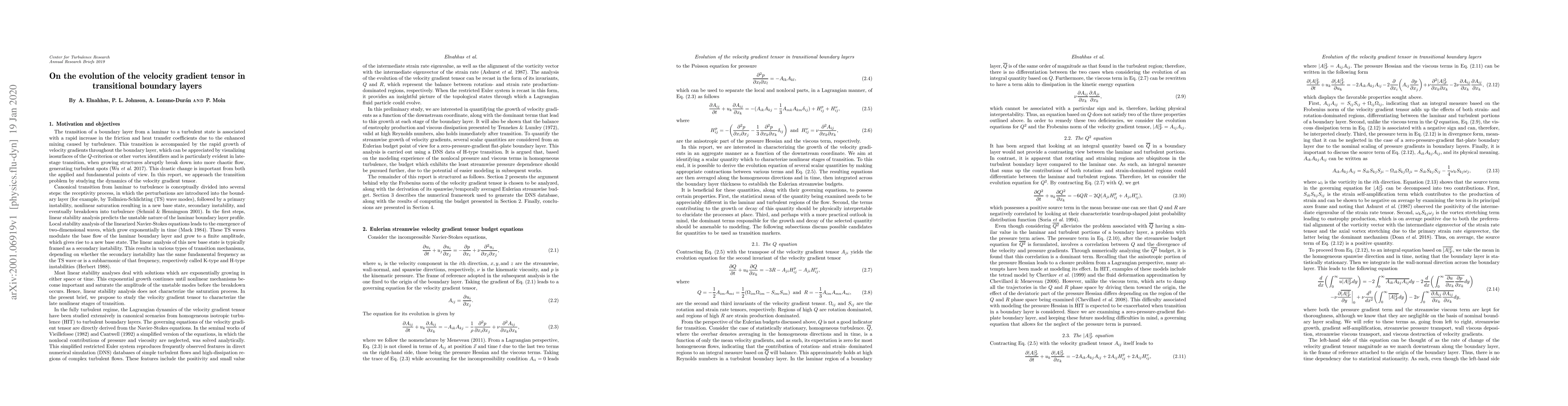 This paper investigates the transition to turbulence in boundary layers by analyzing the dynamics of the velocity gradient tensor, deriving transport equations based on tensor invariants, and discussing their potential for future modeling applications. The study aims to understand the emergence of nonlinear structures during transition, as identified by the Q-criterion.