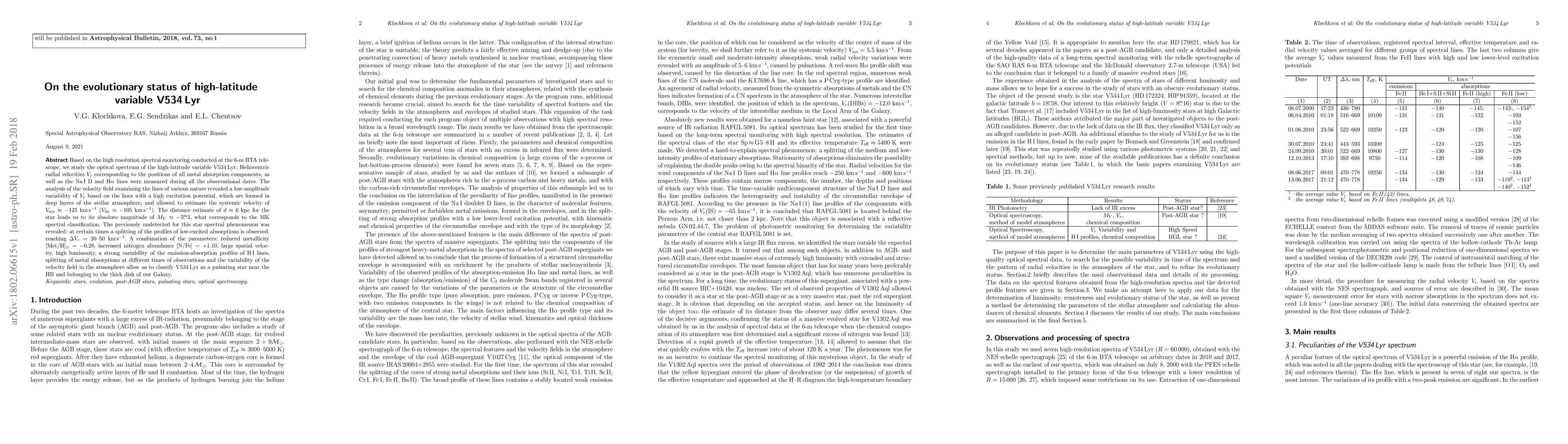 Based on the high resolution spectral monitoring conducted at the 6-m BTA telescope, we study the optical spectrum of the high-latitude variable V534 Lyr. Heliocentric radial velocities Vr corresponding to the positions of all metal absorption components, as well as the NaI D and H$\alpha$ lines were measured during all the observational dates. The analysis of the velocity field examining the lines of various nature revealed a low-amplitude variability of Vr based on the lines with a high excitation potential, which are formed in deep layers of the stellar atmosphere, and allowed to estimate the systemic velocity of Vsys$\approx-125$ km/s (V(lsr)$\approx-105$ km/s). The distance estimate of d$\approx$6 kpc for the star leads us to its absolute magnitude of Mv$\approx -5.3^{m}$, what corresponds to the MK spectral classification. The previously undetected for this star spectral phenomenon was revealed: at certain times a splitting of the profiles of low-excited absorptions is observed, reaching $\Delta$Vr=20$\div$50 km/s. A combination of the parameters: reduced metallicity [Met/H]$_{\odot}=-0.28$, increased nitrogen abundance [N/Fe]=+1.10, large spatial velocity, high luminosity, a strong variability of the emission-absorption profiles of HI lines, splitting of metal absorptions at different observation moments and the variability of the velocity field in the atmosphere allow us to consider V534 Lyr as a pulsating star in the instability band near the HB and belonging to the thick disk of our Galaxy.