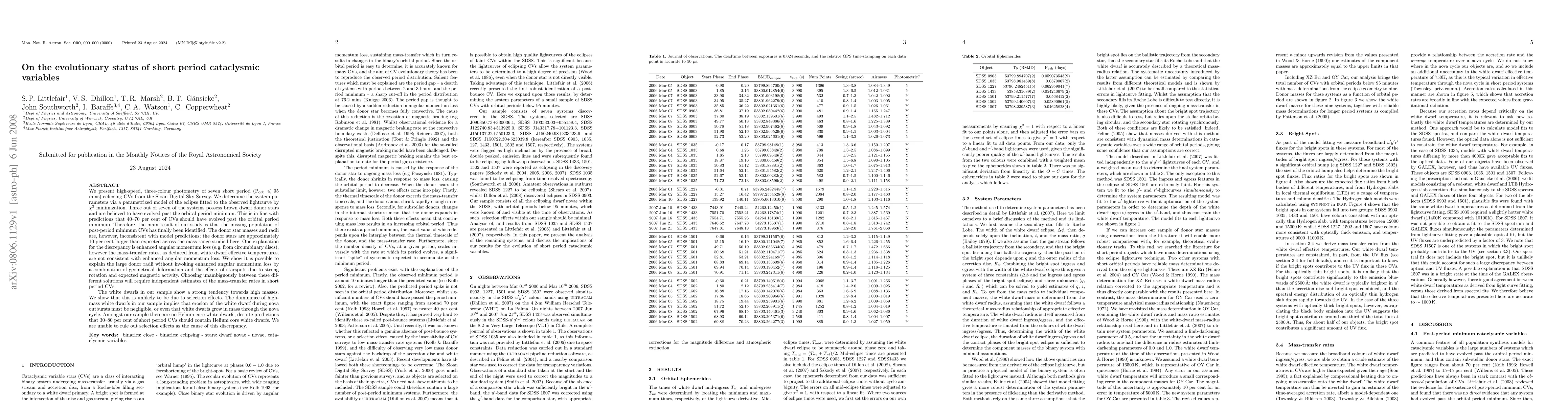 (Abridged) We present high-speed, three-colour photometry of seven short period (Porb <= 95 mins) eclipsing CVs from the Sloan Digital Sky Survey. We determine the system parameters via a parametrized model of the eclipse fitted to the observed lightcurve by chi2 minimization. Three out of seven of the systems possess brown dwarf donor stars and are believed to have evolved past the orbital period minimum. This is in line with predictions that 40-70 per cent of CVs should have evolved past the orbital period minimum. Therefore, the main result of our study is that the missing population of post-period minimum CVs has finally been identified. The donor star masses and radii are, however, inconsistent with model predictions; the donor stars are approximately 10 per cent larger than expected across the mass range studied here. One explanation for the discrepancy is enhanced angular momentum loss (e.g. from circumbinary discs), however the mass-transfer rates, as deduced from white dwarf effective temperatures, are not consistent with enhanced angular momentum loss. We show it is possible to explain the large donor radii without invoking enhanced angular momentum loss by a combination of geometrical deformation and the effects of starspots due to strong rotation and expected magnetic activity. Choosing unambiguously between these different solutions will require independent estimates of the mass-transfer rates in short period CVs.