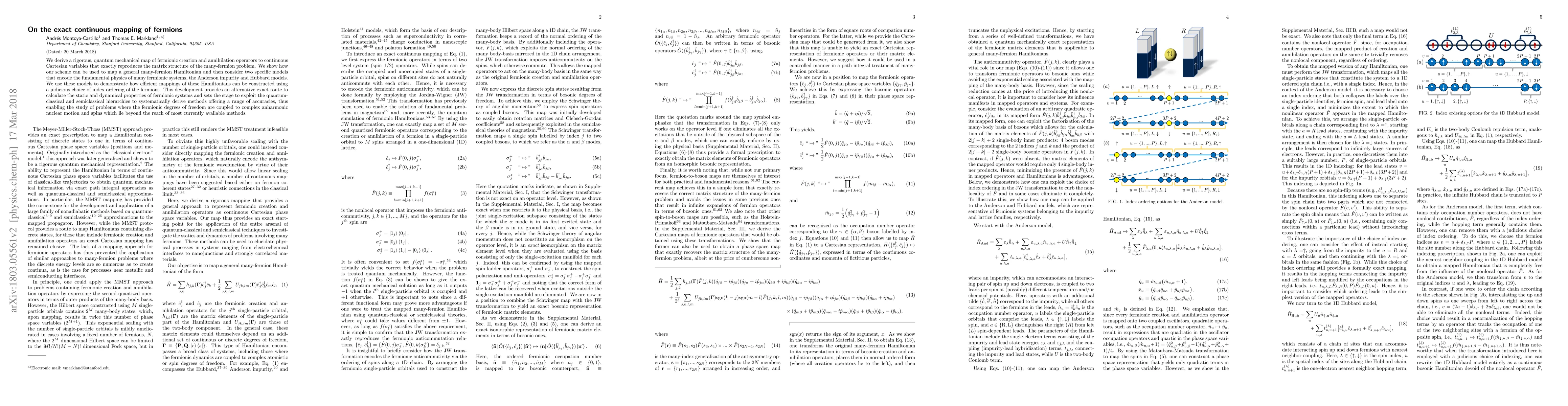 We derive a rigorous, quantum mechanical map of fermionic creation and annihilation operators to continuous Cartesian variables that exactly reproduces the matrix structure of the many-fermion problem. We show how our scheme can be used to map a general many-fermion Hamiltonian and then consider two specific models that encode the fundamental physics of many fermionic systems, the Anderson impurity and Hubbard models. We use these models to demonstrate how efficient mappings of these Hamiltonians can be constructed using a judicious choice of index ordering of the fermions. This development provides an alternative exact route to calculate the static and dynamical properties of fermionic systems and sets the stage to exploit the quantum-classical and semiclassical hierarchies to systematically derive methods offering a range of accuracies, thus enabling the study of problems where the fermionic degrees of freedom are coupled to complex anharmonic nuclear motion and spins which lie beyond the reach of most currently available methods.