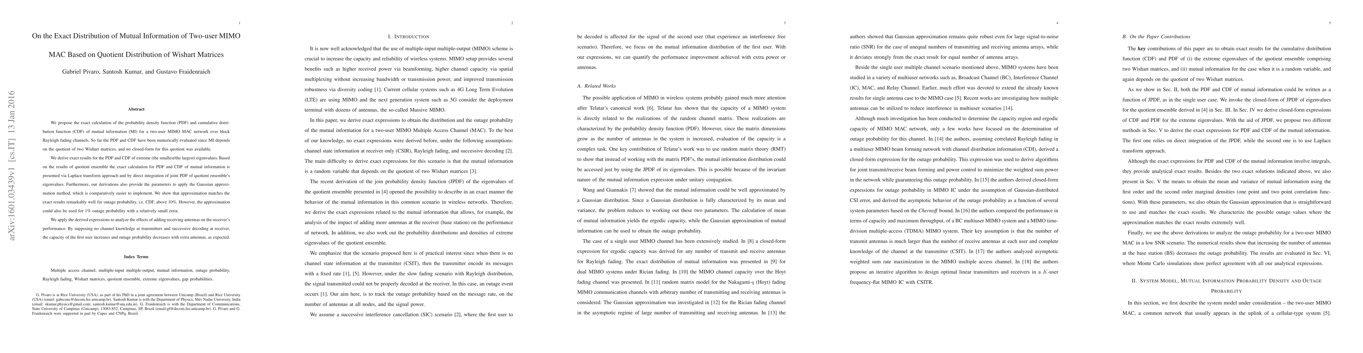 We propose the exact calculation of the probability density function (PDF) and cumulative distribution function (CDF) of mutual information (MI) for a two-user MIMO MAC network over block Rayleigh fading channels. So far the PDF and CDF have been numerically evaluated since MI depends on the quotient of two Wishart matrices, and no closed-form for this quotient was available. We derive exact results for the PDF and CDF of extreme (the smallest/the largest) eigenvalues. Based on the results of quotient ensemble the exact calculation for PDF and CDF of mutual information is presented via Laplace transform approach and by direct integration of joint PDF of quotient ensemble's eigenvalues. Furthermore, our derivations also provide the parameters to apply the Gaussian approximation method, which is comparatively easier to implement. We show that approximation matches the exact results remarkably well for outage probability, i.e. CDF, above 10%. However, the approximation could also be used for 1% outage probability with a relatively small error. We apply the derived expressions to analyze the effects of adding receiving antennas on the receiver's performance. By supposing no channel knowledge at transmitters and successive decoding at receiver, the capacity of the first user increases and outage probability decreases with extra antennas, as expected.