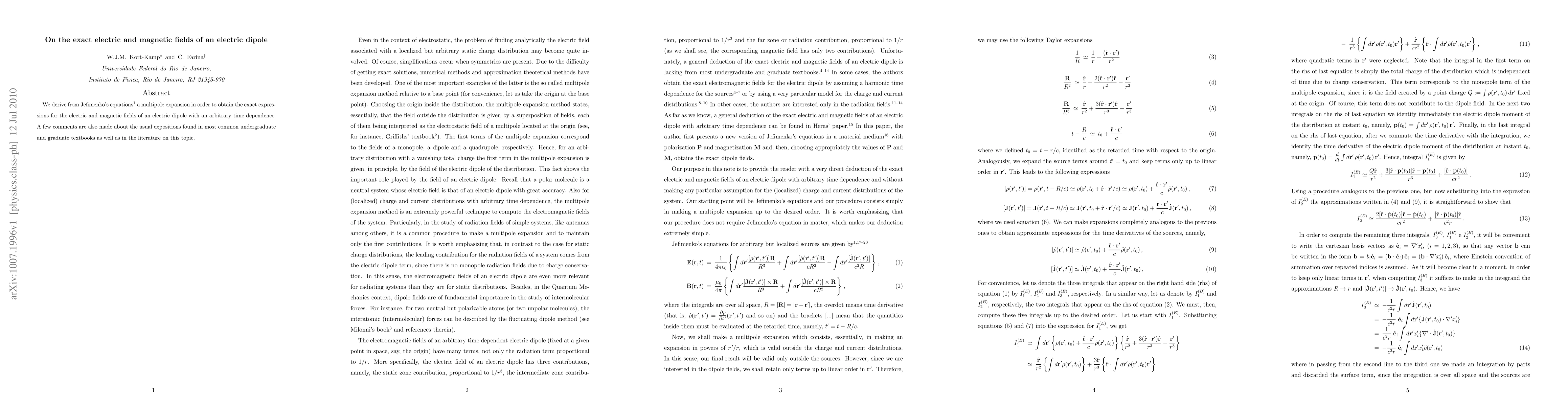 This paper derives exact electric and magnetic field expressions for an electric dipole using Jefimenko's equations and a multipole expansion, providing a detailed analysis that contrasts with typical textbook presentations. It also discusses the differences from conventional methods found in standard educational materials.