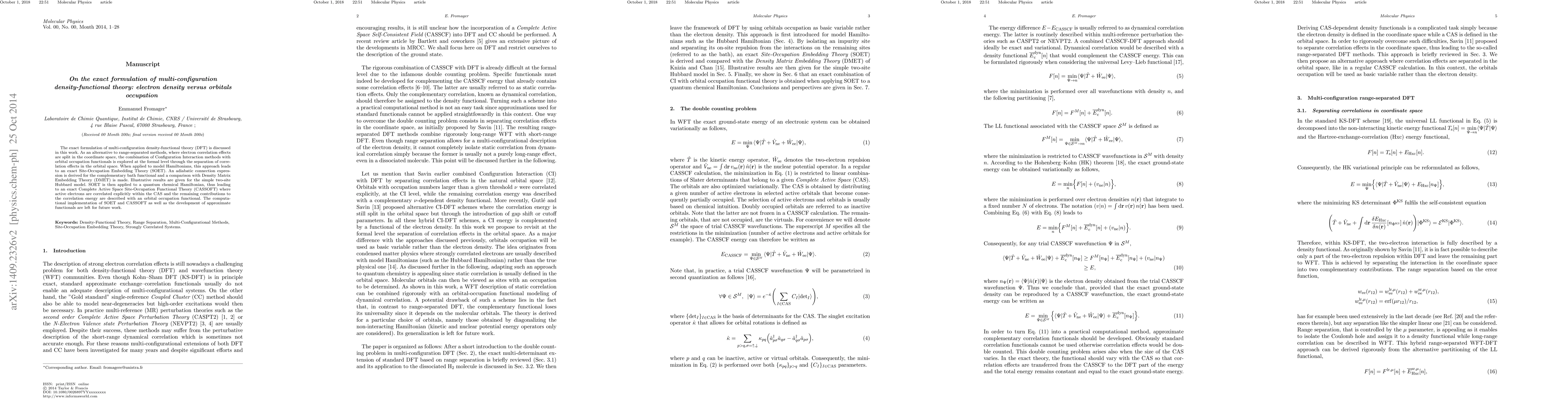 This paper explores an exact formulation of multi-configuration density-functional theory (DFT) using Configuration Interaction methods combined with orbital occupation functionals, leading to Site-Occupation Embedding Theory (SOET) and Complete Active Space Site-Occupation Functional Theory (CASSOFT). The approach compares favorably with Density Matrix Embedding Theory (DMET) and is demonstrated on the two-site Hubbard model.