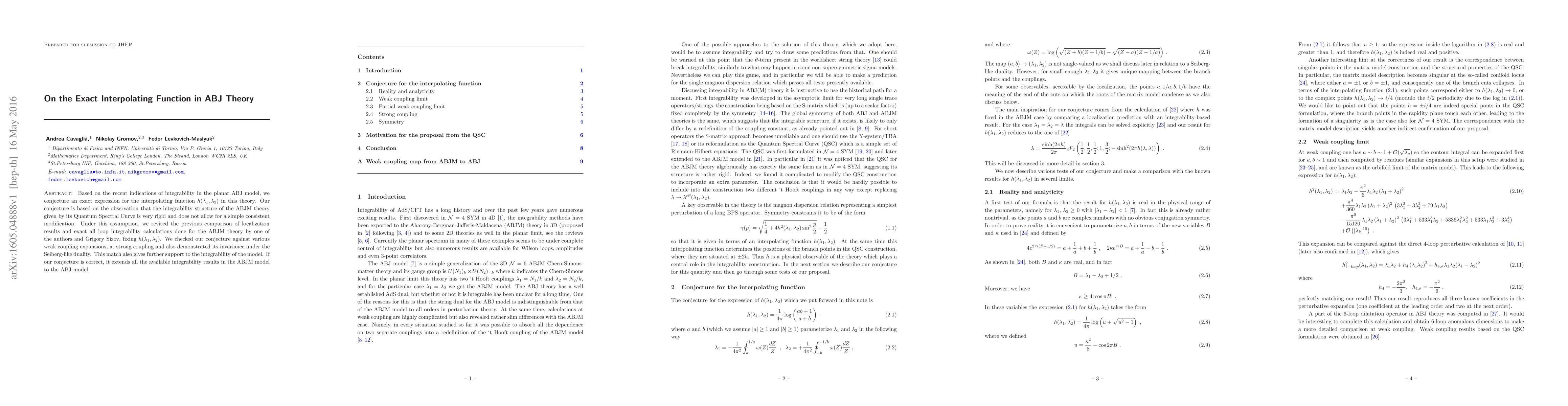 The research conjectures an exact expression for the interpolating function h(λ1,λ2) in ABJ theory based on integrability indications in the planar ABJ model, revising previous comparisons with localization results and exact all-loop integrability calculations in ABJM theory.