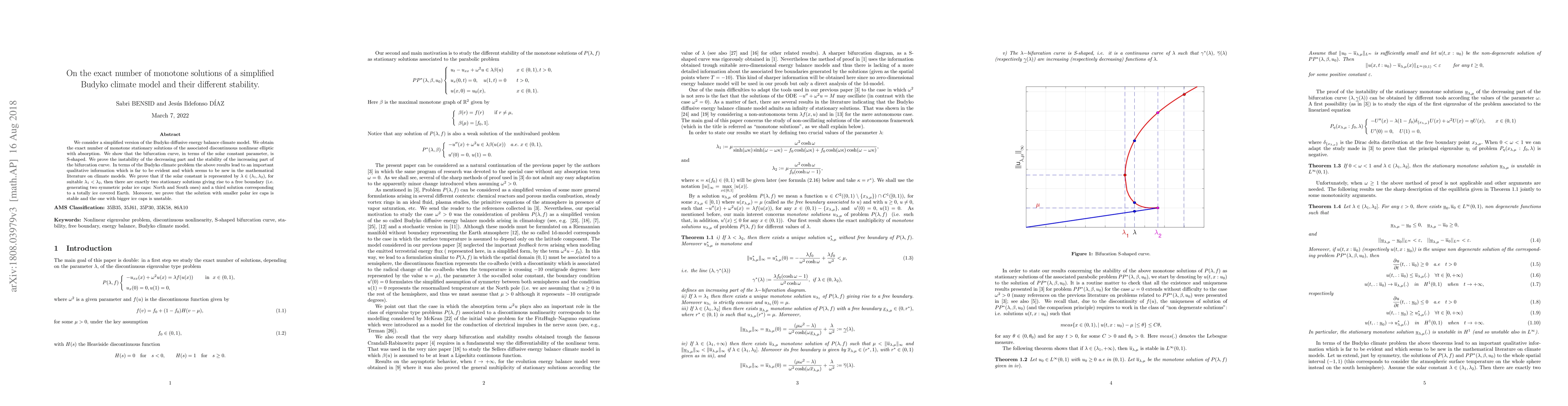 We consider a simplified version of the Budyko diffusive energy balance climate model. We obtain the exact number of monotone stationary solutions of the associated discontinuous nonlinear elliptic with absorption. We show that the bifurcation curve, in terms of the solar constant parameter, is S-shaped. We prove the instability of the decreasing part and the stability of the increasing part of the bifurcation curve. In terms of the Budyko climate problem the above results lead to an important qualitative information which is far to be evident and which seems to be new in the mathematical literature on climate models. We prove that if the solar constant is represented by $\lambda \in (\lambda _{1},\lambda _{2}),$ for suitable $\lambda _{1}<\lambda _{2},$ then there are exactly two stationary solutions giving rise to a free boundary (i.e. generating two symmetric polar ice caps: North and South ones) and a third solution corresponding to a totally ice covered Earth. Moreover, we prove that the solution with smaller polar ice caps is stable and the one with bigger ice caps is unstable.