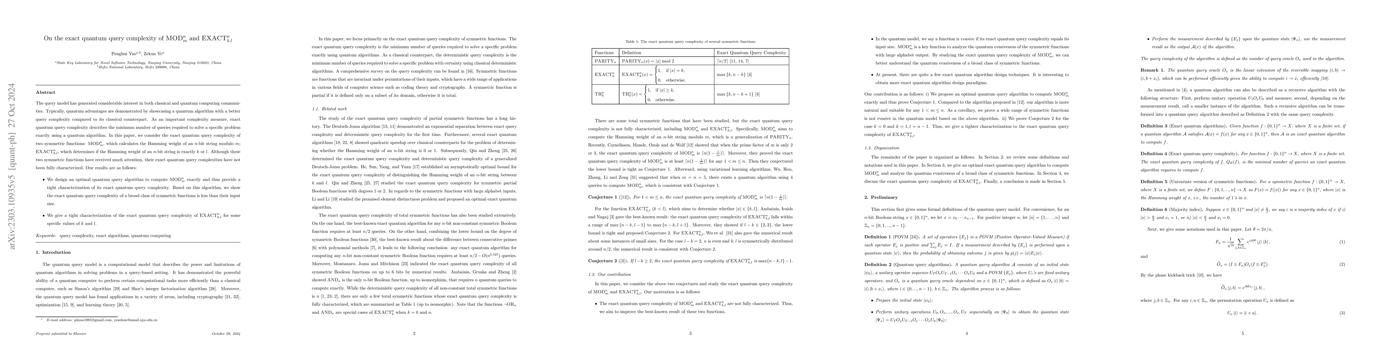This paper explores the exact quantum query complexity for two specific $n$-bit symmetric functions: $\text{MOD}_m^n$ and $\text{EXACT}_{k,l}^n$. It presents optimal quantum algorithms achieving query complexities of $\lceil n(1-\frac{1}{m}) \rceil$ for $\text{MOD}_m^n$ and resolves conjectures for $\text{EXACT}_{k,l}^n$ when $l-k \ge 2$.
