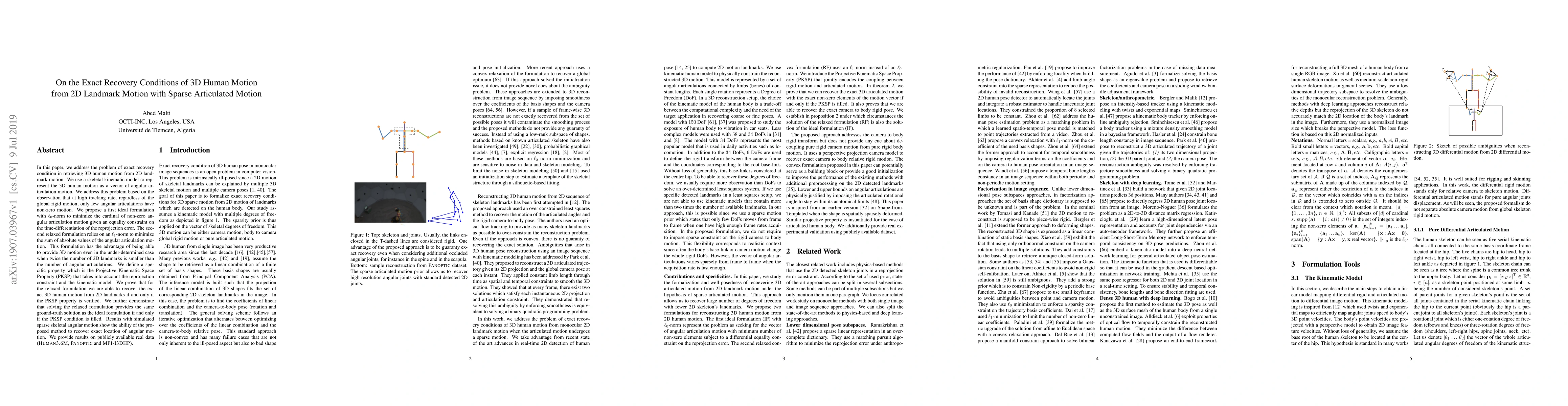 In this paper, we address the problem of exact recovery condition in retrieving 3D human motion from 2D landmark motion. We use a skeletal kinematic model to represent the 3D human motion as a vector of angular articulation motion. We address this problem based on the observation that at high tracking rate, regardless of the global rigid motion, only few angular articulations have non-zero motion. We propose a first ideal formulation with $\ell_0$-norm to minimize the cardinal of non-zero angular articulation motion given an equality constraint on the time-differentiation of the reprojection error. The second relaxed formulation relies on an $\ell_1$-norm to minimize the sum of absolute values of the angular articulation motion. This formulation has the advantage of being able to provide 3D motion even in the under-determined case when twice the number of 2D landmarks is smaller than the number of angular articulations. We define a specific property which is the Projective Kinematic Space Property (PKSP) that takes into account the reprojection constraint and the kinematic model. We prove that for the relaxed formulation we are able to recover the exact 3D human motion from 2D landmarks if and only if the PKSP property is verified. We further demonstrate that solving the relaxed formulation provides the same ground-truth solution as the ideal formulation if and only if the PKSP condition is filled. Results with simulated sparse skeletal angular motion show the ability of the proposed method to recover exact location of angular motion. We provide results on publicly available real data (HUMAN3.6M, PANOPTIC and MPI-I3DHP).