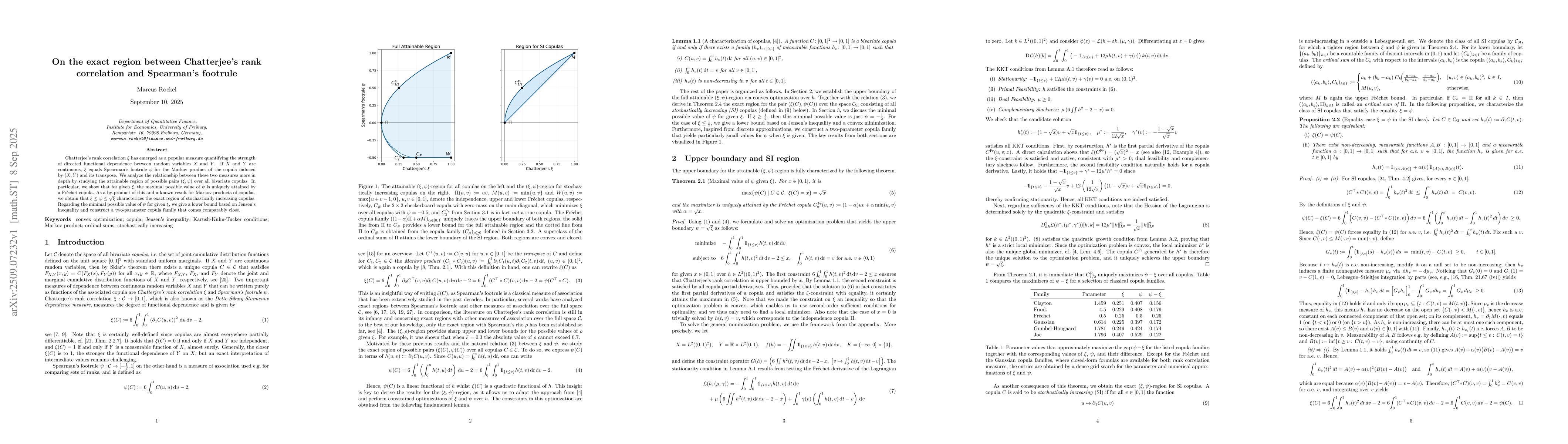Chatterjee's rank correlation \(\xi\) has emerged as a popular measure quantifying the strength of directed functional dependence between random variables $X$ and $Y$. If $X$ and $Y$ are continuous, $\xi$ equals Spearman's footrule~\(\psi\) for the Markov product of the copula induced by $(X,Y)$ and its transpose. We analyze the relationship between these two measures more in depth by studying the attainable region of possible pairs \((\xi, \psi)\) over all bivariate copulas. In particular, we show that for given $\xi$, the maximal possible value of $\psi$ is uniquely attained by a Fr\'echet copula. As a by-product of this and a known result for Markov products of copulas, we obtain that \(\xi\le\psi\le \sqrt{\xi}\) characterizes the exact region of stochastically increasing copulas. Regarding the minimal possible value of \(\psi\) for given \(\xi\), we give a lower bound based on Jensen's inequality and construct a two-parameter copula family that comes comparably close.