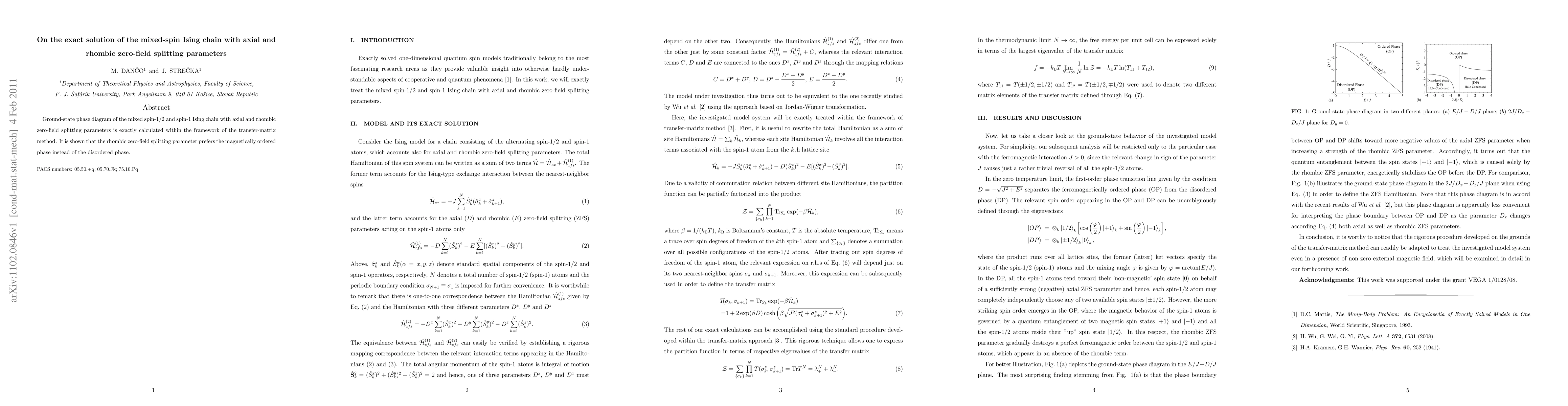 The study uses the transfer-matrix method to calculate the ground-state phase diagram of a mixed-spin Ising chain with axial and rhombic zero-field splitting parameters, finding that the rhombic parameter prefers a magnetically ordered state over disorder.
