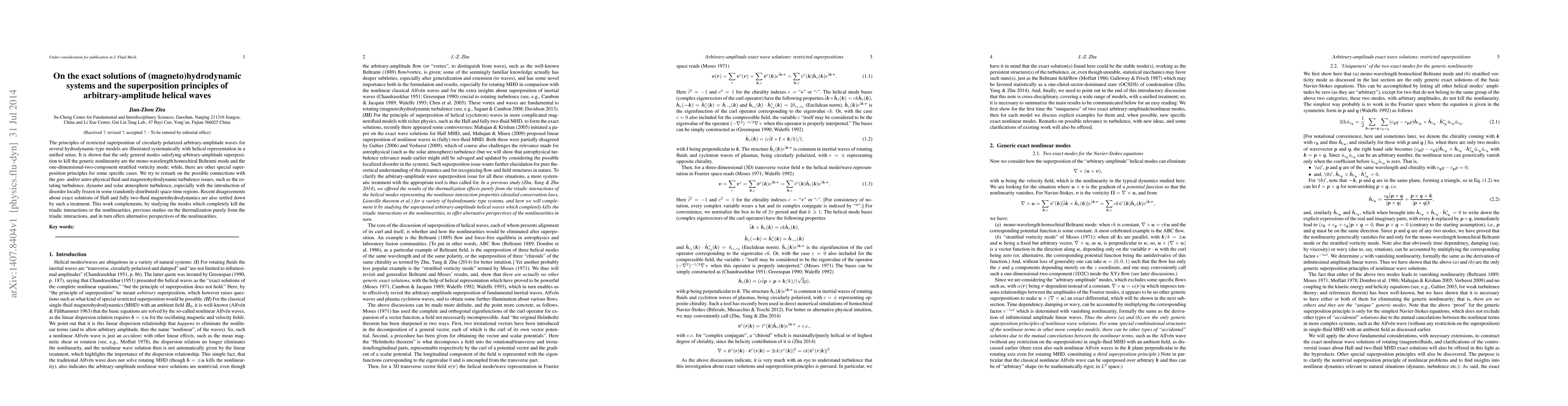 The principles of restricted superposition of circularly polarized arbitrary-amplitude waves for several hydrodynamic type models are illustrated systematically with helical representation in a unified sense. It is shown that the only general modes satisfying arbitrary-amplitude superposition to kill the generic nonlinearity are the mono-wavelength homochiral Beltrami mode and the one-dimensional-two-component stratified vorticity mode, which we call the XYz flow/wave; while, there are other special superposition principles for some specific cases. We try to remark on the possible connections with the geo- and/or astro-physical fluid and magnetohydrodynamic turbulence issues, such as the rotating turbulence, dynamo and solar atmosphere turbulence, especially with the introduction of disorder locally frozen in some (randomly distributed) space-time regions. Recent disagreements about exact solutions of Hall and fully two-fluid magnetohydrodynamics are also settled down by such a treatment. This work complements, by studying the modes which completely kill the triadic interactions or the nonlinearities, previous studies on the thermalization purely from the triadic interactions, and in turn offers alternative perspectives of the nonlinearities.