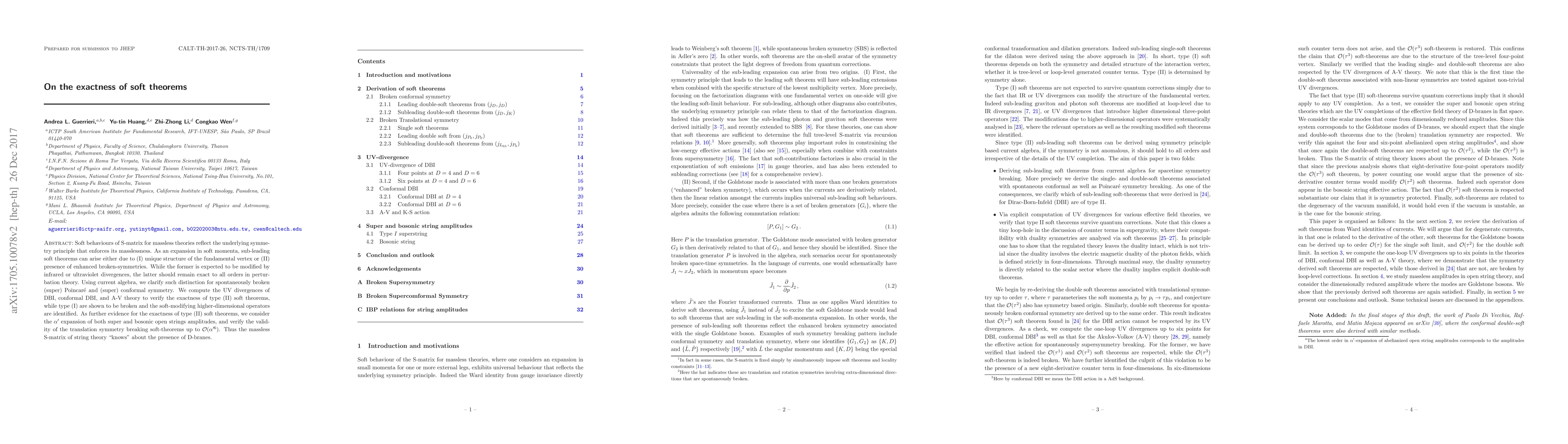 Soft behaviours of S-matrix for massless theories reflect the underlying symmetry principle that enforces its masslessness. As an expansion in soft momenta, sub-leading soft theorems can arise either due to (I) unique structure of the fundamental vertex or (II) presence of enhanced broken-symmetries. While the former is expected to be modified by infrared or ultraviolet divergences, the latter should remain exact to all orders in perturbation theory. Using current algebra, we clarify such distinction for spontaneously broken (super) Poincar\'e and (super) conformal symmetry. We compute the UV divergences of DBI, conformal DBI, and A-V theory to verify the exactness of type (II) soft theorems, while type (I) are shown to be broken and the soft-modifying higher-dimensional operators are identified. As further evidence for the exactness of type (II) soft theorems, we consider the alpha' expansion of both super and bosonic open strings amplitudes, and verify the validity of the translation symmetry breaking soft-theorems up to O(alpha'^6). Thus the massless S-matrix of string theory "knows" about the presence of D-branes.