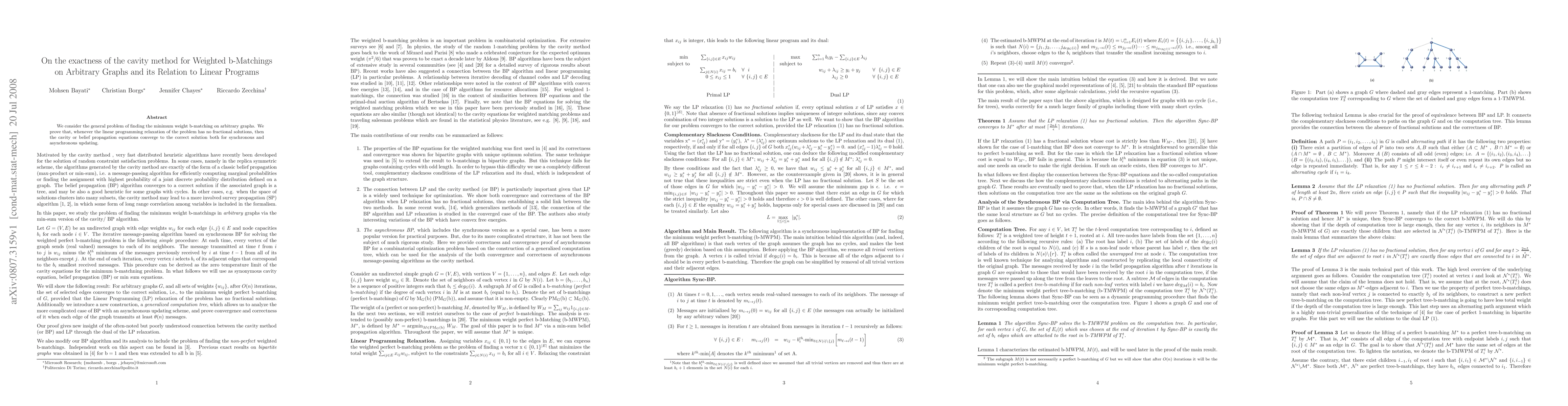 We consider the general problem of finding the minimum weight b-matching on arbitrary graphs. We prove that, whenever the linear programming relaxation of the problem has no fractional solutions, then the cavity or belief propagation equations converge to the correct solution both for synchronous and asynchronous updating.