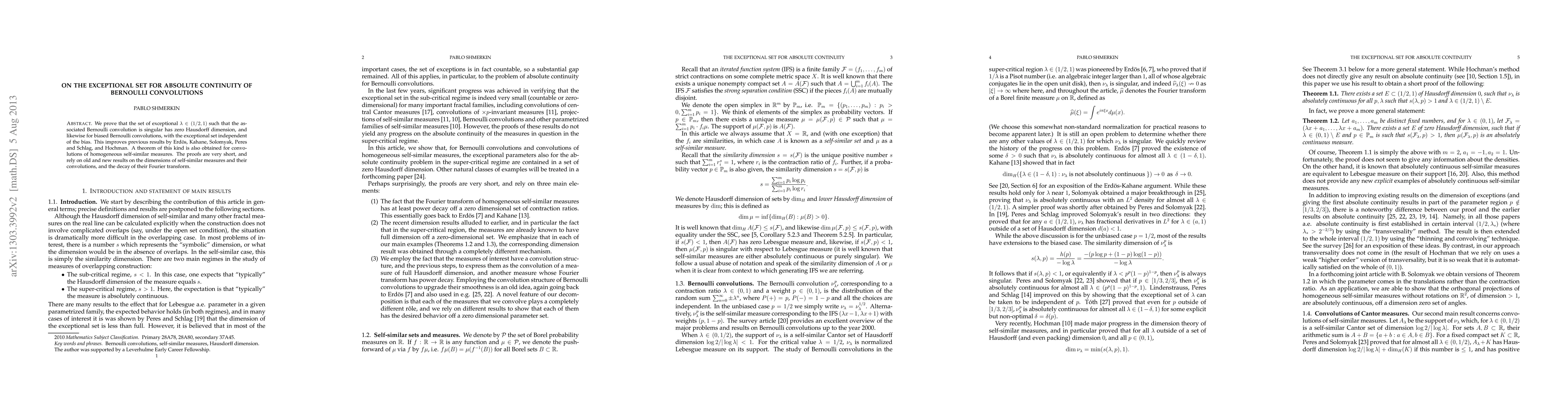 This paper demonstrates that the Hausdorff dimension of the exceptional set for $\lambda \in (1/2,1)$ where Bernoulli convolutions are singular is zero, improving upon earlier results. The proofs leverage established and novel findings on the dimensions of self-similar measures and their convolutions, along with the decay of their Fourier transforms.