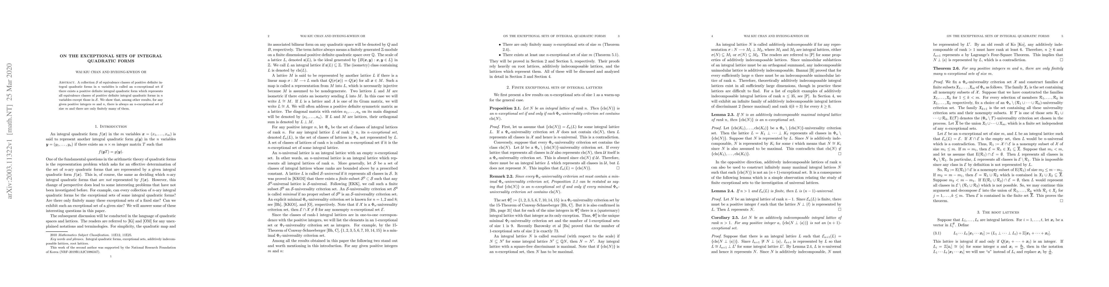 This paper investigates $n$-exceptional sets of positive definite integral quadratic forms, demonstrating the existence of sets of size $m$ that exclude a finite number of equivalence classes, and proving that such sets are finite in number.