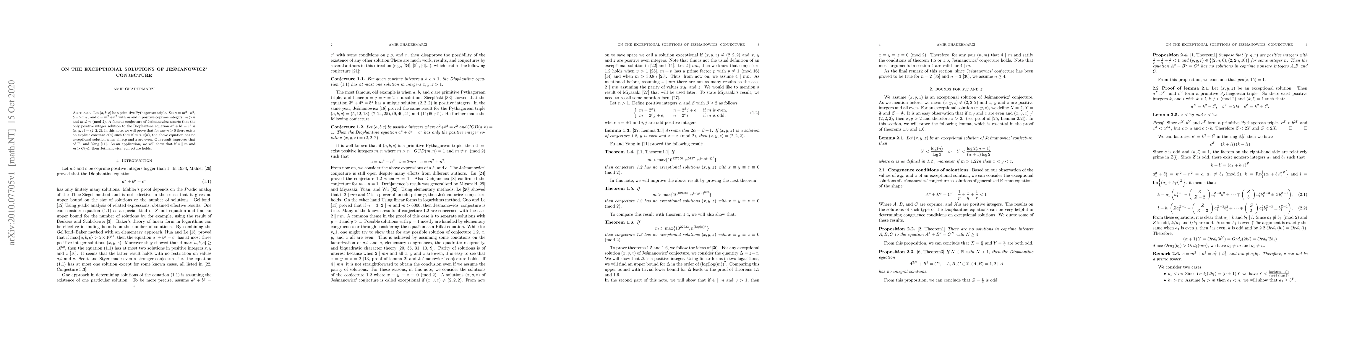Let $(a,b,c)$ be a primitive Pythagorean triple. Set $a=m^2-n^2$,$b=2mn$, and $c=m^2+n^2$ with $m$ and $n$ positive coprime integers, $m>n $ and $ m \not \equiv n \pmod 2$. A famous conjecture of Je\'{s}manowicz asserts that the only positive solution to the Diophantine equation $a^x+b^y=c^z$ is $(x,y,z)(2,2,2).$ In this note, we will prove that for any $n>0$ there exists an explicit constant $c(n)>0$ such that if $m> c(n)$, then the above equation has no exceptional solution when all $x$,$y$ and $z$ are even. Our result improves that of Fu and Yang [11]. As an application, we will show that if $4 \mid\!\mid m$ and $m > c(n)$ Je\'{s}manowicz' conjecture holds.