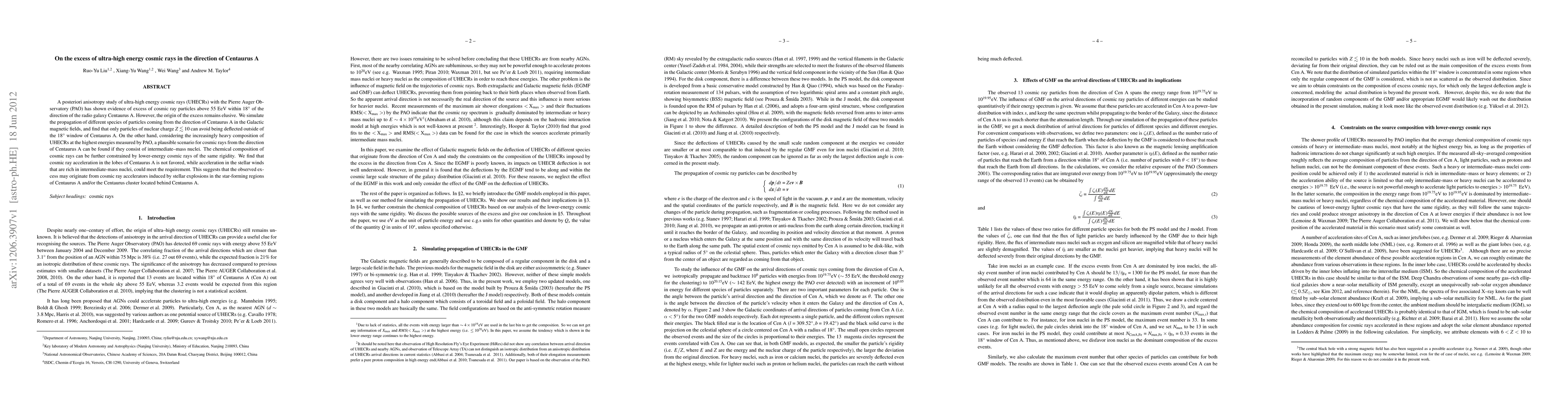 The Pierre Auger Observatory detected an excess of ultra-high energy cosmic rays near Centaurus A, suggesting they may originate from intermediate-mass nuclei. Simulations indicate that cosmic rays from Centaurus A likely come from stellar explosions in its star-forming regions or the Centaurus cluster.