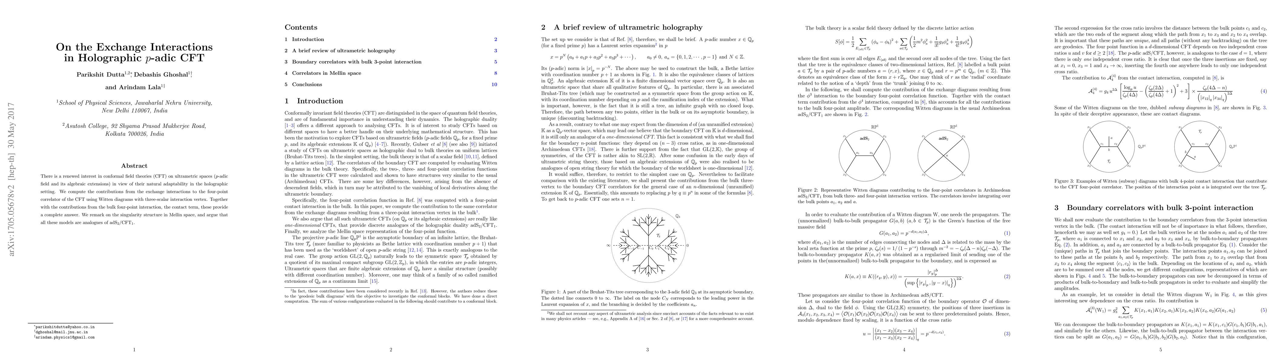 There is a renewed interest in conformal field theories (CFT) on ultrametric spaces (p-adic field and its algebraic extensions) in view of their natural adaptability in the holographic setting. We compute the contributions from the exchange interactions to the four-point correlator of the CFT using Witten diagrams with three-scalar interaction vertex. Together with the contributions from the bulk four-point interaction, the contact term, these provide a complete answer. We remark on the singularity structure in Mellin space, and argue that all these models are analogues of adS_2/CFT_1.