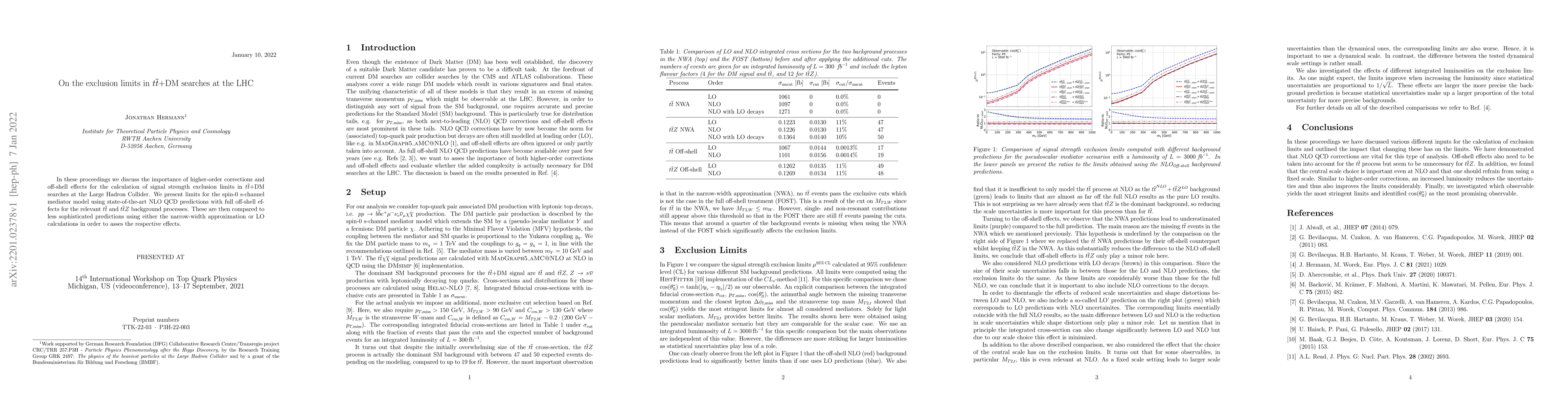 In these proceedings we discuss the importance of higher-order corrections and off-shell effects for the calculation of signal strength exclusion limits in $t\bar{t}+$DM searches at the Large Hadron Collider. We present limits for the spin-0 s-channel mediator model using state-of-the-art NLO QCD predictions with full off-shell effects for the relevant $t\bar{t}$ and $t\bar{t}Z$ background processes. These are then compared to less sophisticated predictions using either the narrow-width approximation or LO calculations in order to asses the respective effects.