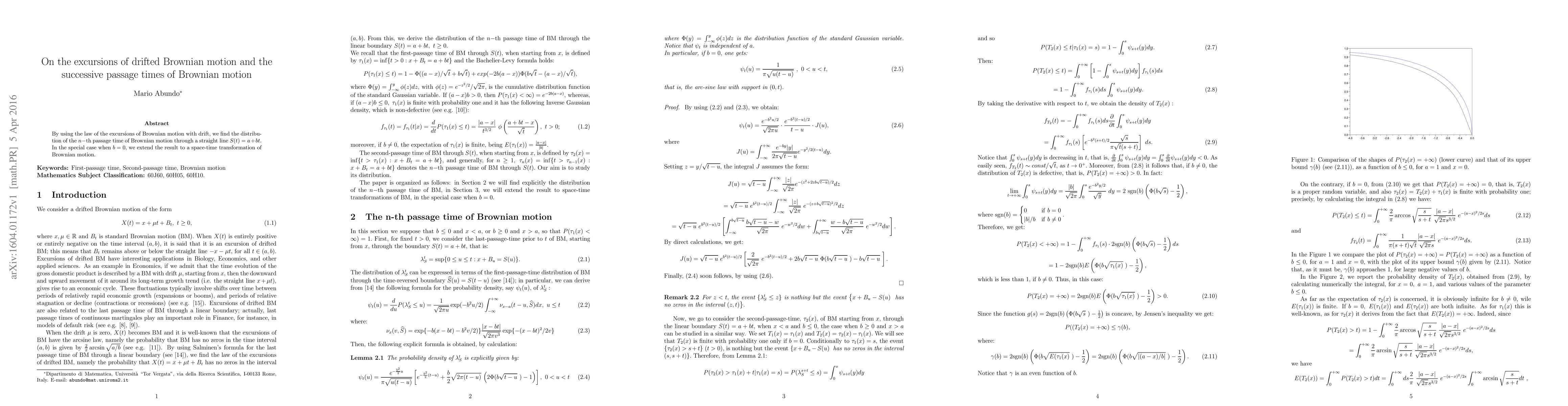By using the law of the excursions of Brownian motion with drift, we find the distribution of the $n-$th passage time of Brownian motion through a straight line $S(t)= a + bt.$ In the special case when $b = 0,$ we extend the result to a space-time transformation of Brownian motion.
