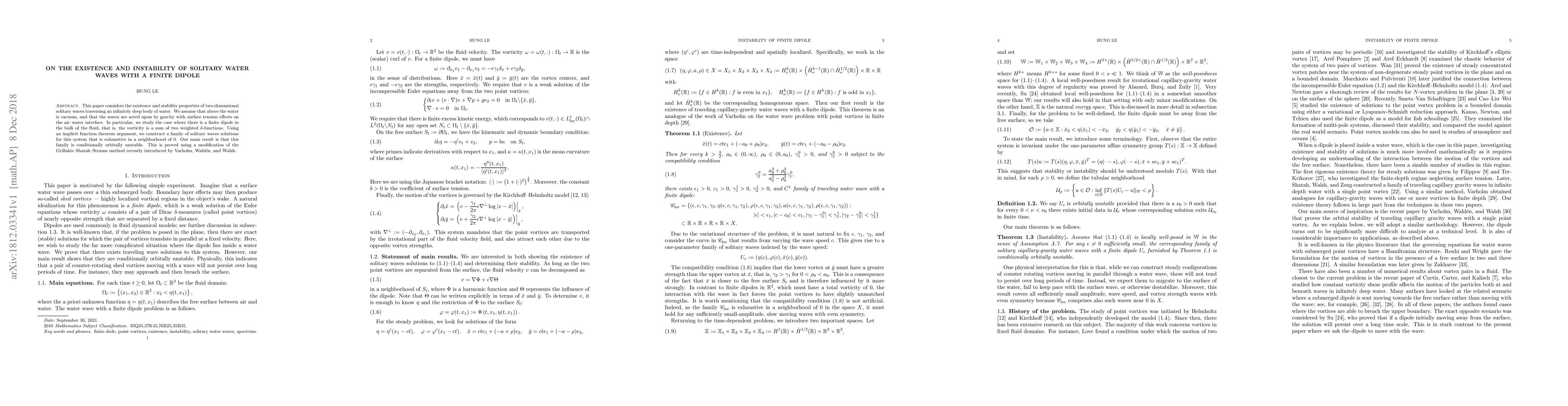 This paper considers the existence and stability properties of two-dimensional solitary waves traversing an infinitely deep body of water. We assume that above the water is vacuum, and that the waves are acted upon by gravity with surface tension effects on the air--water interface. In particular, we study the case where there is a finite dipole in the bulk of the fluid, that is, the vorticity is a sum of two weighted $\delta$-functions. Using an implicit function theorem argument, we construct a family of solitary waves solutions for this system that is exhaustive in a neighborhood of $0$. Our main result is that this family is conditionally orbitally unstable. This is proved using a modification of the Grillakis--Shatah--Strauss method recently introduced by Varholm, Wahl\'en, and Walsh.