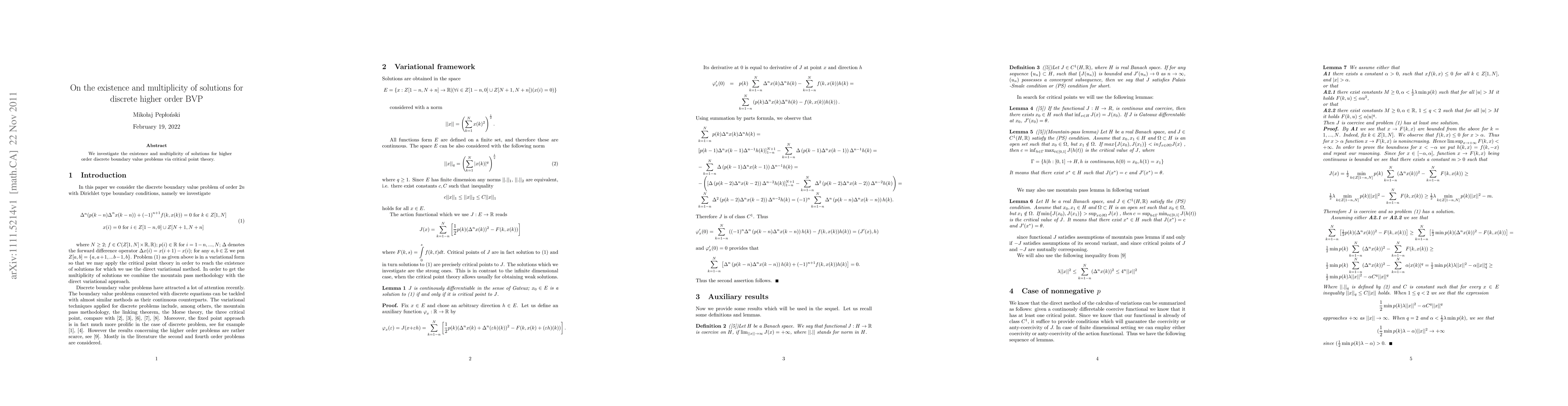 Summary: This paper explores the existence and multiplicity of solutions for higher order discrete boundary value problems using critical point theory. The study employs advanced mathematical techniques to analyze the problem and derive significant results regarding the solutions.